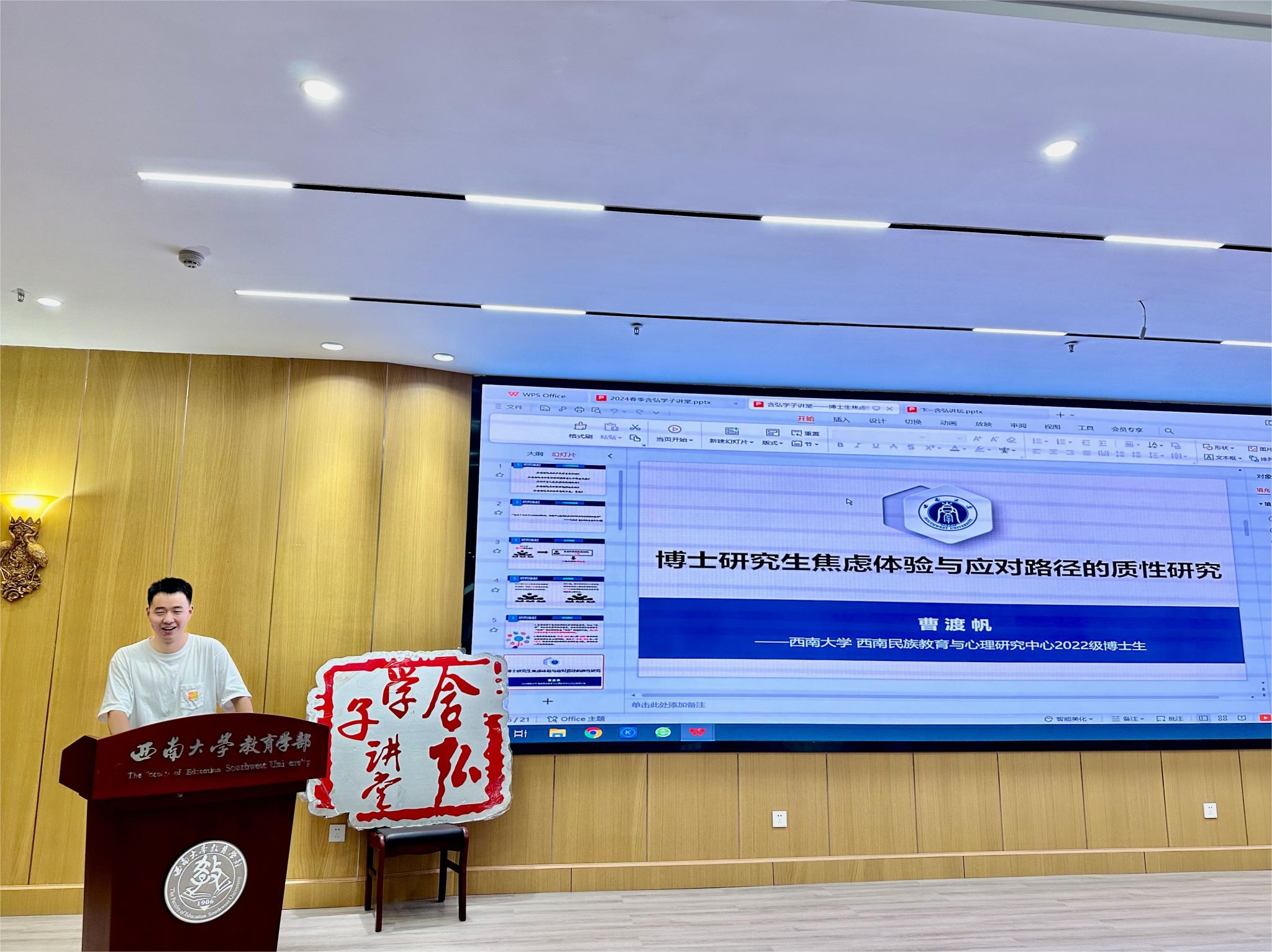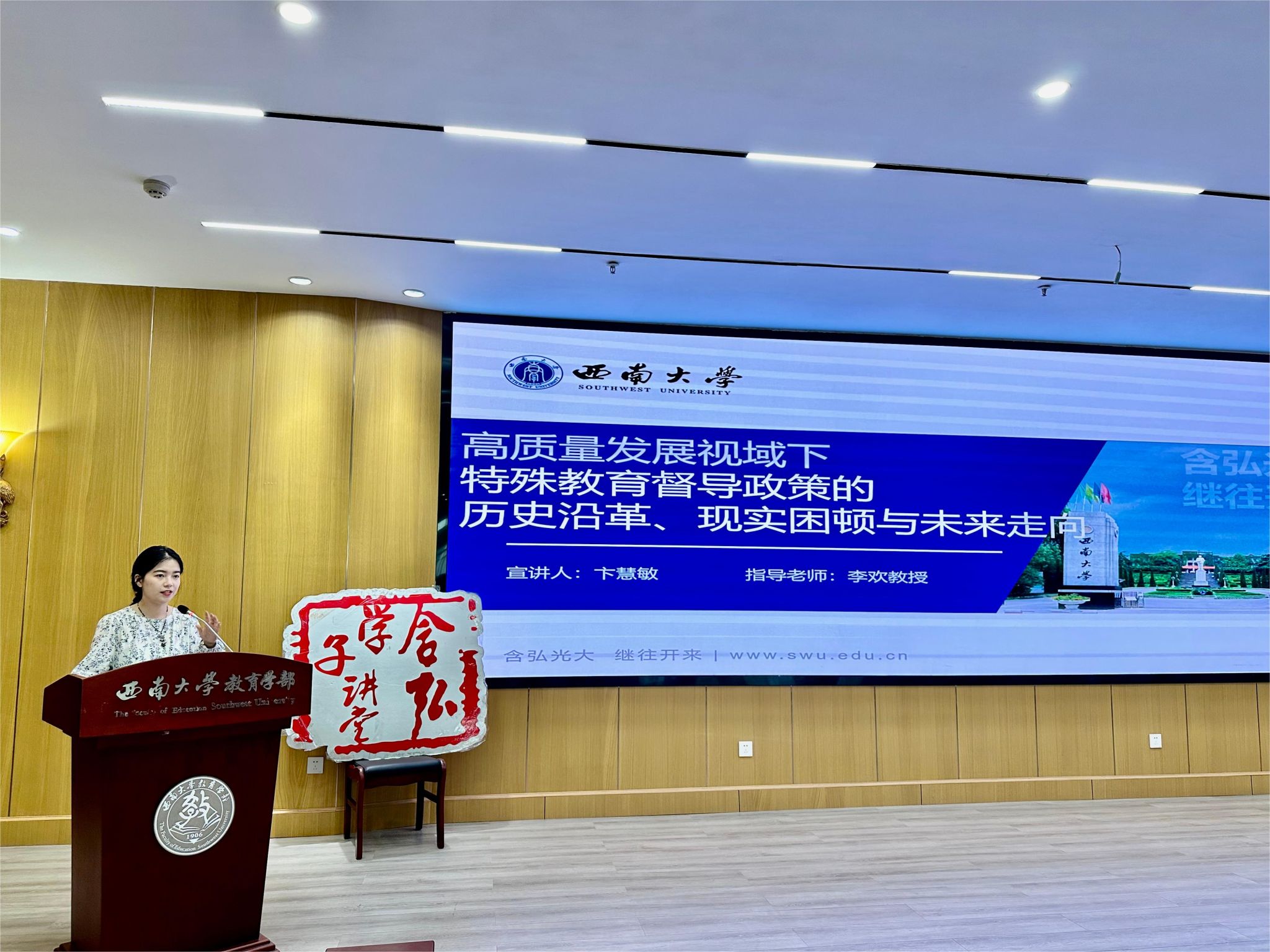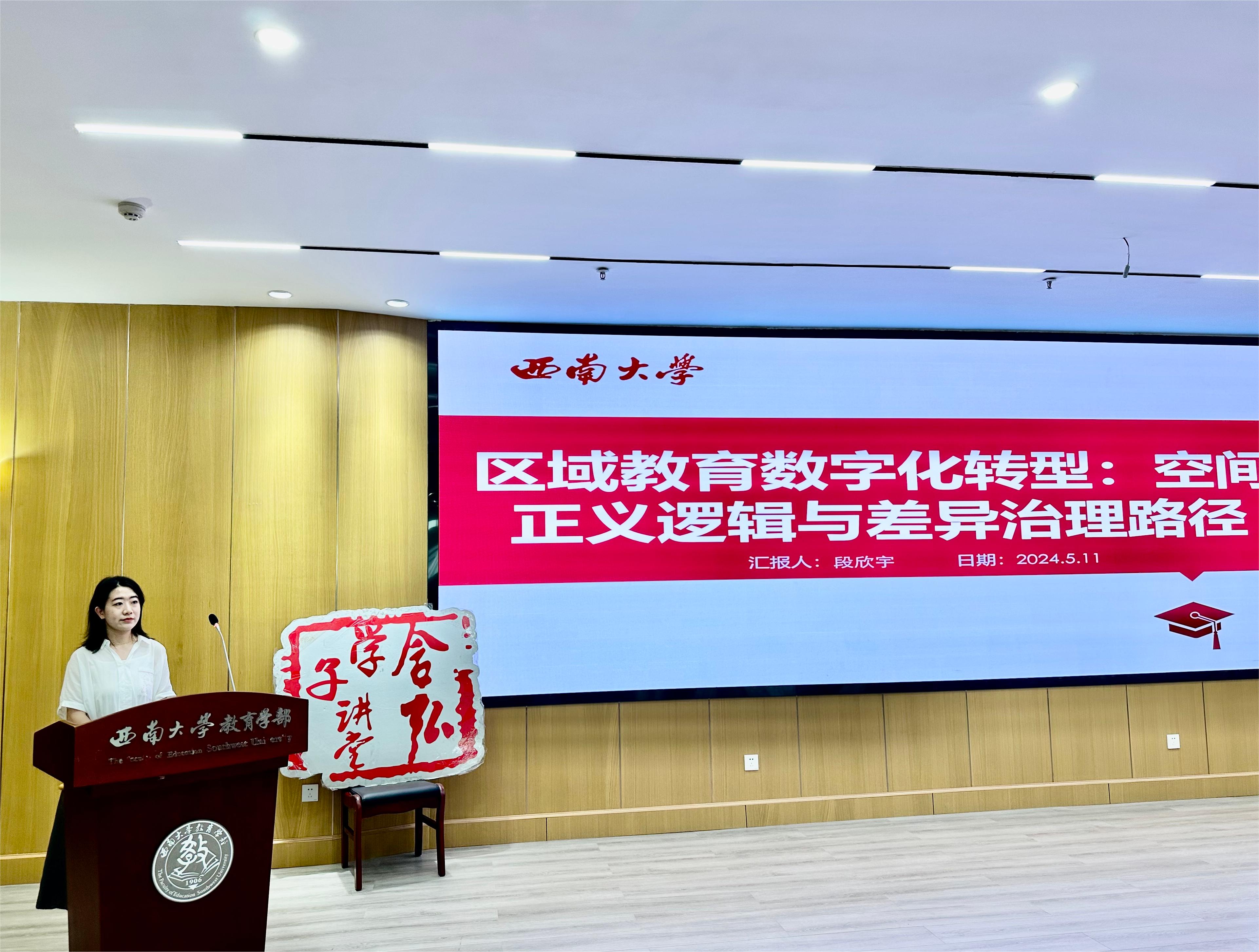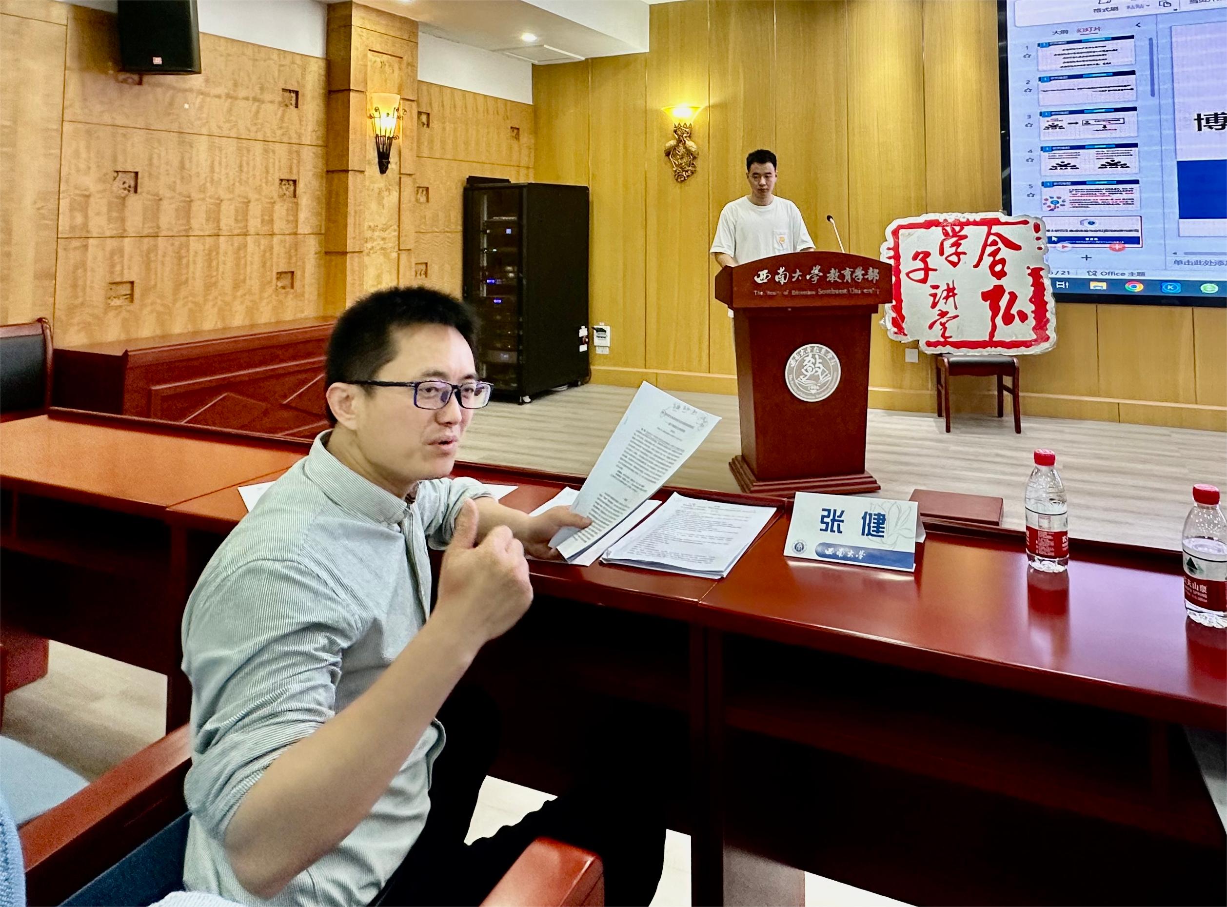 首先,段欣宇、铁必杰、卞慧敏、曹渡帆四位同学分别以《区域教育数字化转型:空间正义逻辑与差异治理路径》、《Empathy to Creativity : Behavioral and Neuroscientific Perspectives on Everyday Creativity》、《高质量发展视域下特殊教育督导政策的历史沿革、现实困顿与未来走向》、《博士研究生焦虑体验与应对路径的质性研究》为主题,向与会者汇报各自的学习研究成果。