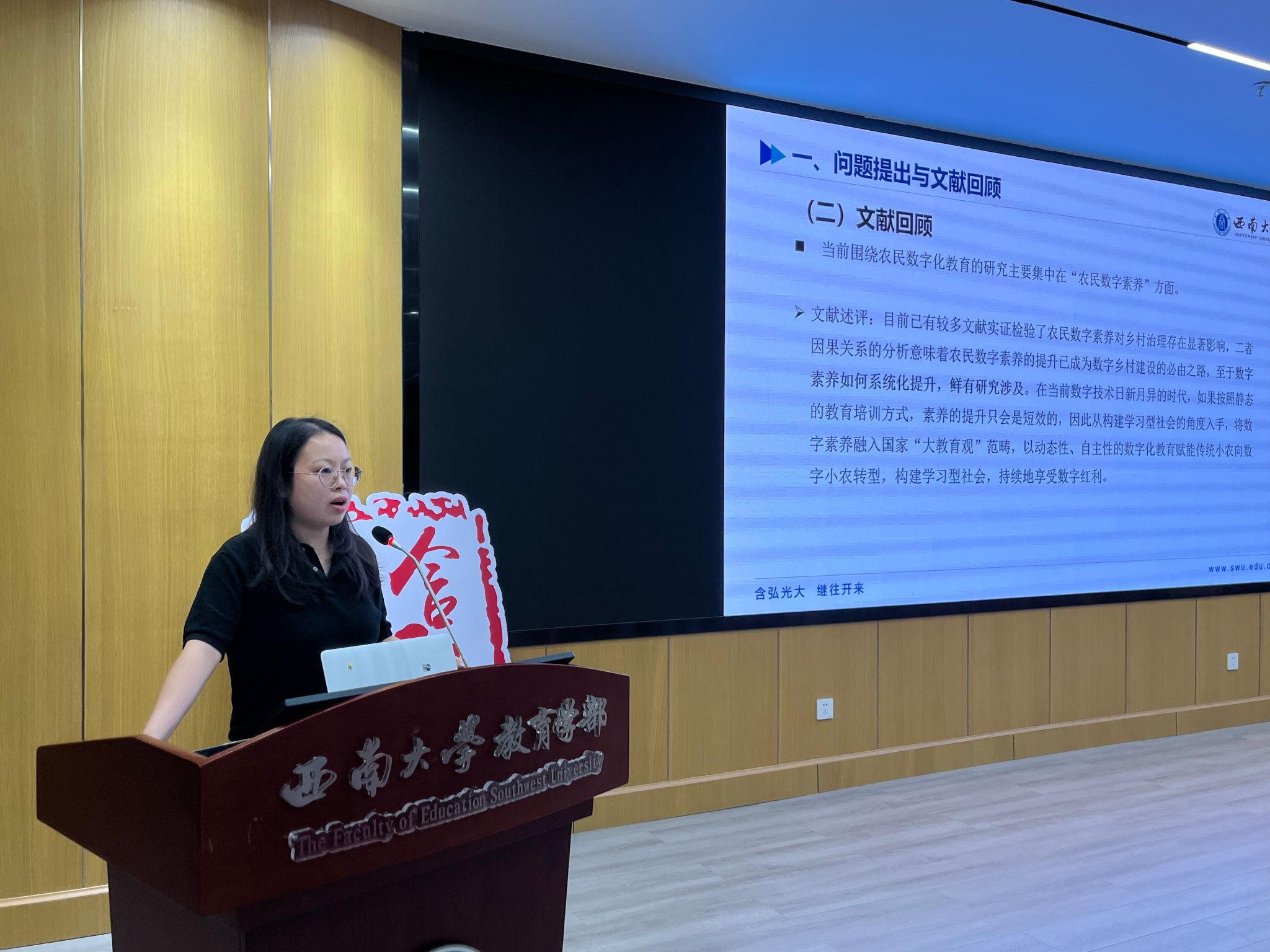 中心2024级教育领导与教育管理专业博士研究生谢根瑞,以“农民数字化教育促进乡村治理共同体建构的作用机理与实现路径”为题进行分享。她研究成果的主要内容是实现乡村有效治理不仅是乡村振兴的重要内容,也是国家治理体系和治理能力现代化的基石;农民作为乡村振兴的主体,其数字化教育至关重要;在数字化背景下,农民应具备资源利用、公共事务治理、利益聚合三个维度的数字能力。
