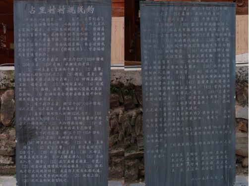 延续至今的占里村六大寨规——人口控制、保护生态、安全用火、不准偷盗、禁止赌博吸毒、杜绝受贿。这六大寨规清清楚楚地刻在寨子里的石碑上,不仅是我国基层社会治理文化的缩影,更是对社会主义核心价值观以及依法治国的基层实践。