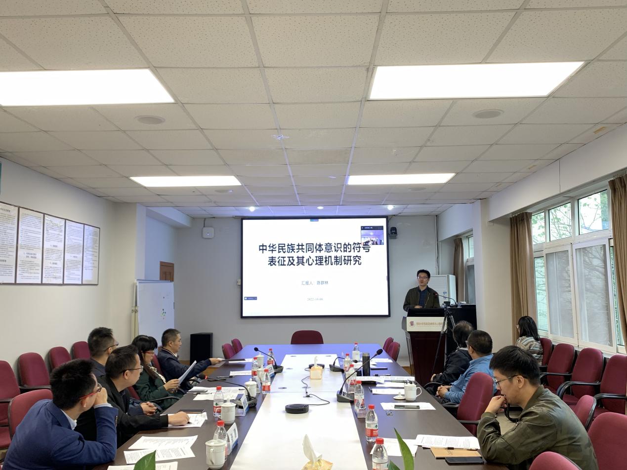 陈群林副教授就《中华民族共同体意识符号表征及其心理机制研究》实验项目的研究目的、研究框架向与会专家进行了陈述,对《汉字字源的多民族共享表征机制》《字源识字教学提升彝族地区一年级儿童通用语学习的实验研究》《红色和民族服饰颜色对认知和自我的加工的影响》《走廊民族(藏彝走廊)的共同文化知觉符号探究》《中华民族共同体音乐情绪加工的神经机制研究》等5个研究方案的设计进行了逐一介绍。