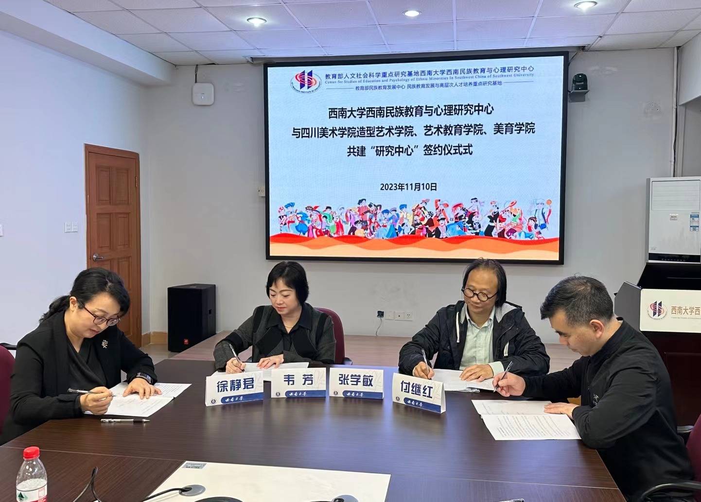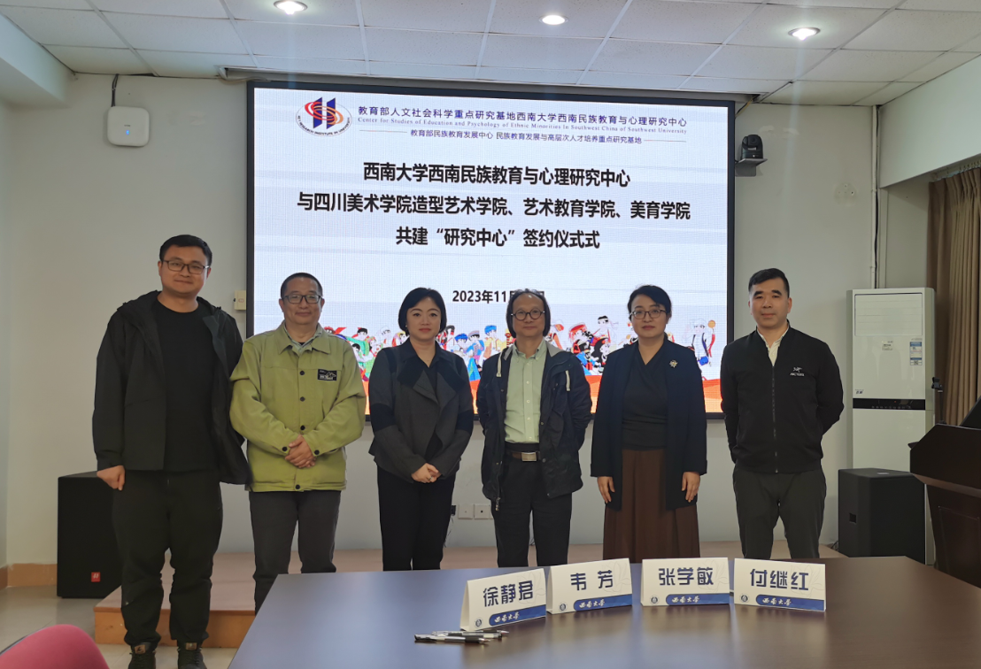 为进一步深化best365英国体育在线西南民族教育与心理研究中心(以下简称“中心”)的对外合作,11月10日下午,四川美术学院造型艺术学院党总支书记、副院长韦芳副教授一行应邀到访西南民族教育与心理研究中心(以下简称“中心”),在best365英国体育在线荟文楼举行座谈会并签订《四川美术学院造型艺术学院、艺术教育学院、美育学院和best365英国体育在线西南民族教育与心理研究中心合作框架协议》。四川美术学院艺术教育学院党总支书记付继红副教授、四川美术学院美育学院副院长徐静君副教授、造型艺术学院“青少年中华民族共同体意识美育研究中心”执行副主任龚梁老师、中心主任张学敏教授、中心副主任蒋立松研究员出席座谈会。会议由蒋立松研究员主持。