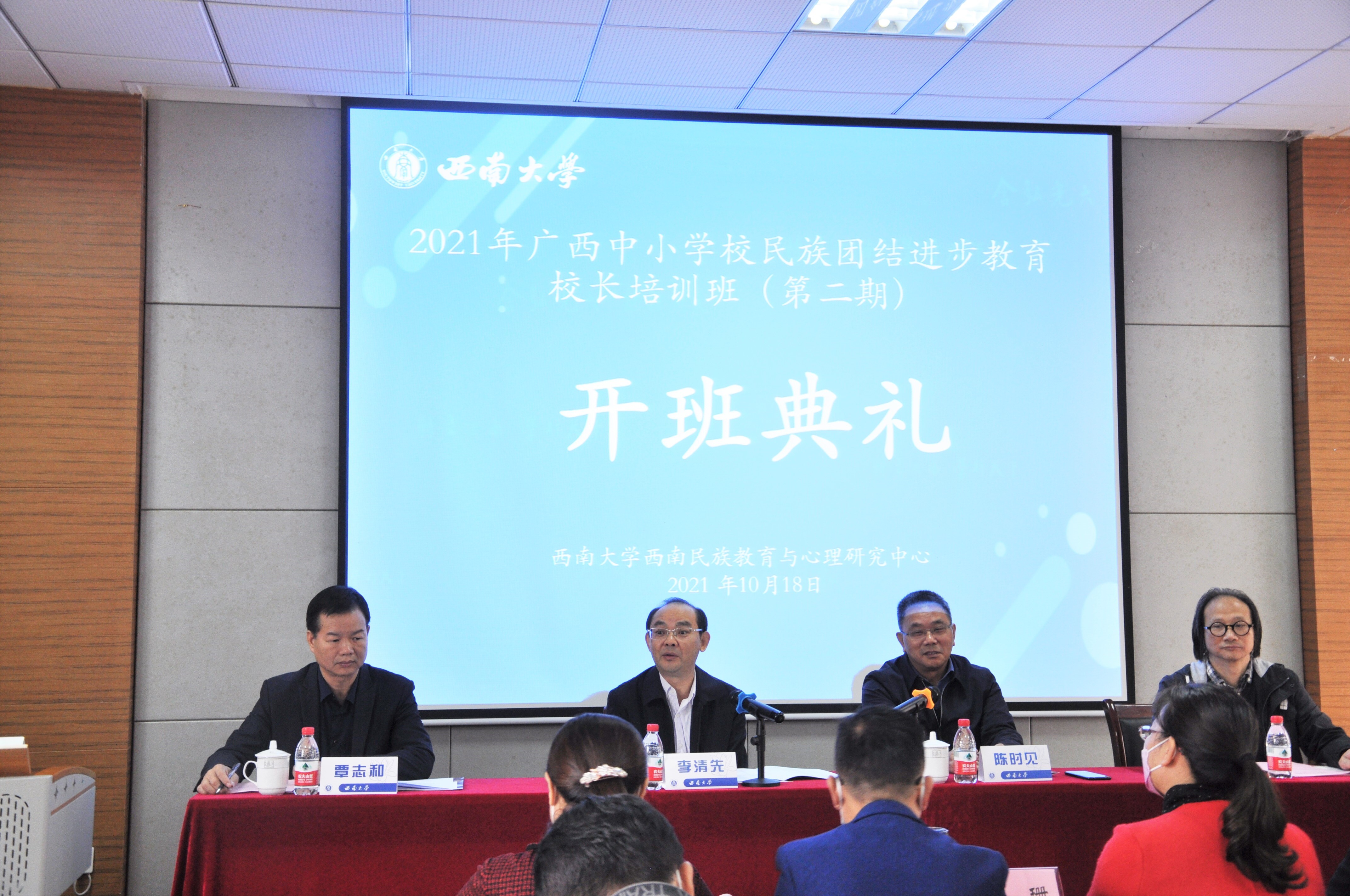 为深入贯彻习近平总书记关于加强和改进民族工作的重要思想和中央民族工作会议精神,全面落实教育部等四部委《深化新时代学校民族团结进步教育指导纲要》,切实做好新时代各级各类学校民族团结进步教育工作,加强各族师生中华民族共同体意识教育。10月18日上午,2021年广西新时代中小学校民族团结进步教育校长培训班(第二期)开班典礼在best365英国体育在线食品科学学院(第39教学楼)312报告厅举行。出席典礼的有广西壮族自治区教育厅副厅长李清先、best365英国体育在线副校长陈时见、广西民族大学继续教育学院院长覃志和、best365英国体育在线西南民族教育与心理研究中心(以下简称“西民中心”)主任张学敏和来自广西壮族自治区各市、县(市、区)中小学校长,共95人。典礼由西民中心主任张学敏主持。