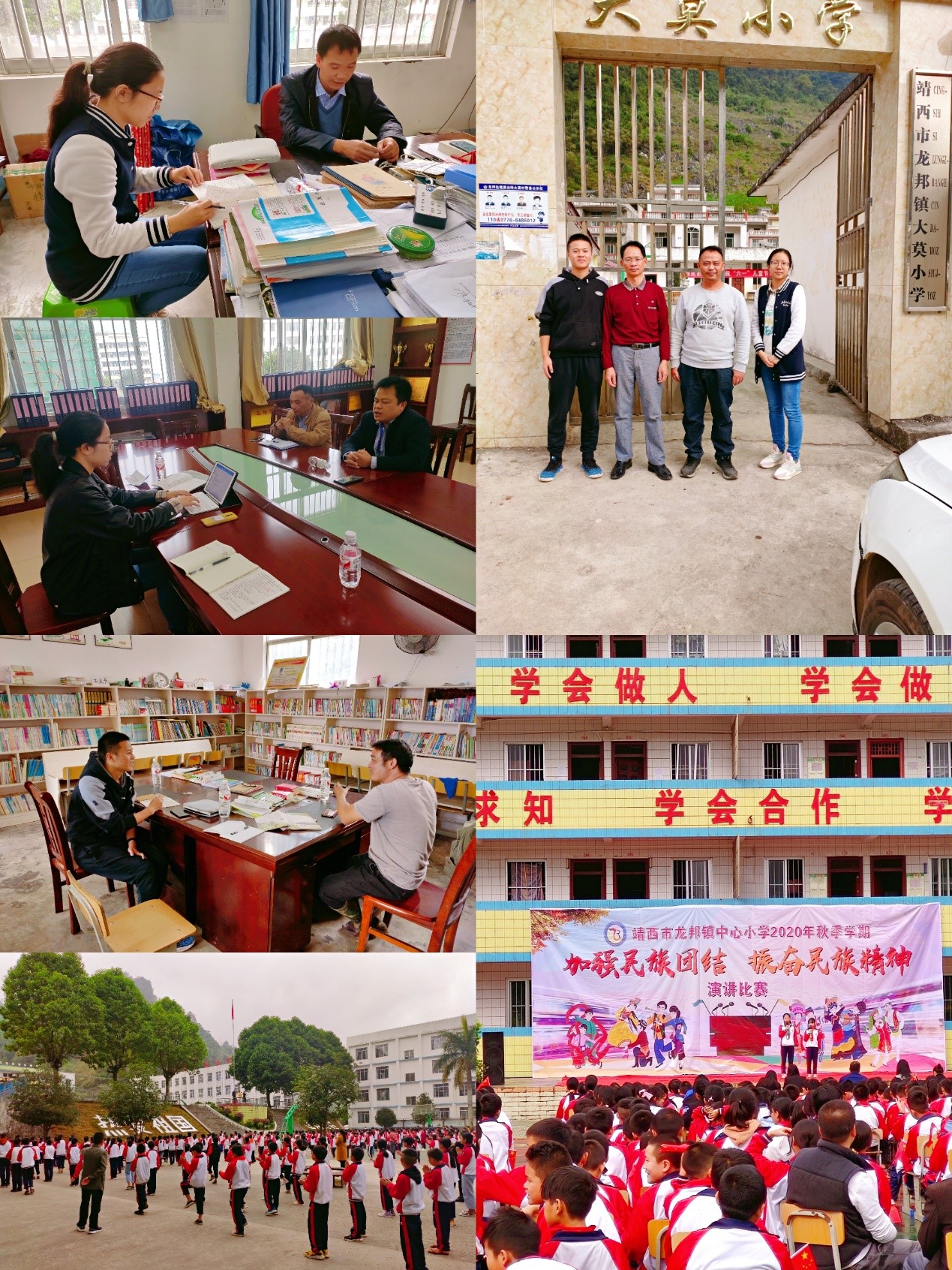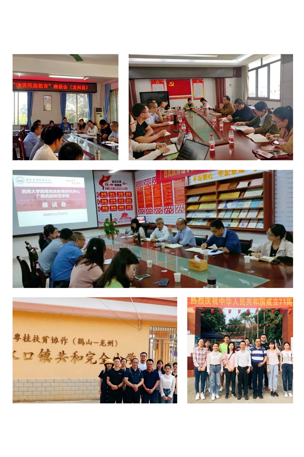 17至22日,调研组先后前往广西民族师范学院、崇左市教育局、龙州县教育局、水口镇学校、水口镇共和完全小学、水口镇合平教学点等地开展座谈和访谈,在调研期间深入了解龙州县义务教育均衡发展、民族文化进校园、国门学校、国家通用语言文字教育教学等重要教育专题的推进状况。此外,针对易地扶贫搬迁、跨国婚姻子女教育、空壳学校等问题,调研组还深入当地住户开展深度访谈。