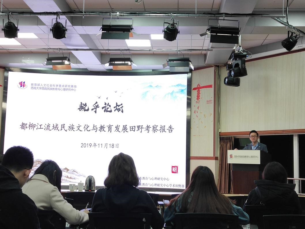 11月18日,由西南民族教育与心理研究中心(以下简称“中心”)主任助理蒋立松研究员带队的“都柳江流域民族文化与教育发展”调查组(以下简称“调查组”)在説乎斋报告厅举行田野考察报告会。会议由龚梁主持,调查组成员吴燕君、张馨、程紫嫣和任芷若分别作主题汇报,蒋立松研究员、张健副研究员、培养办主任陈伦超老师及中心全体硕博研究生聆听了此次报告会。