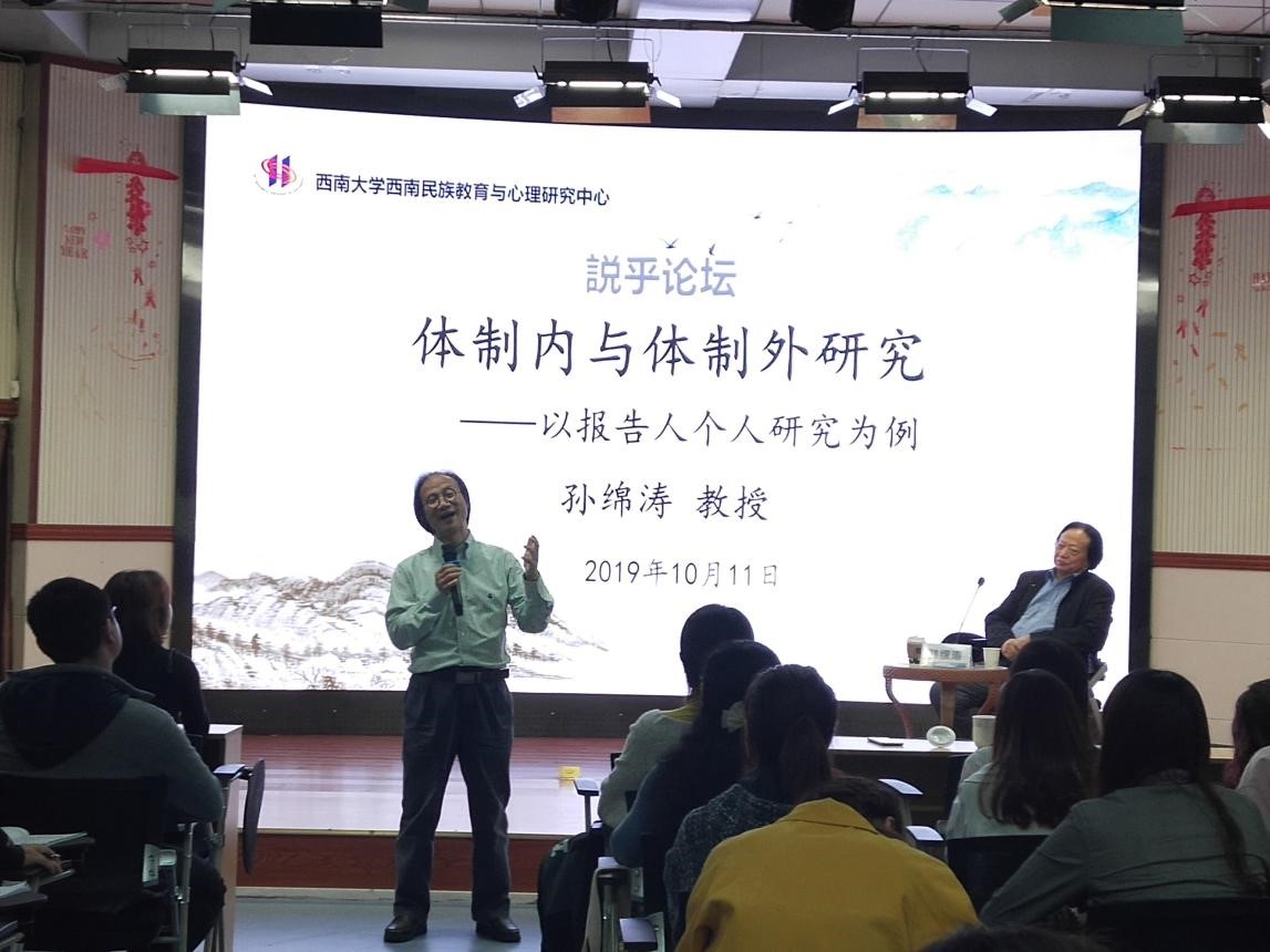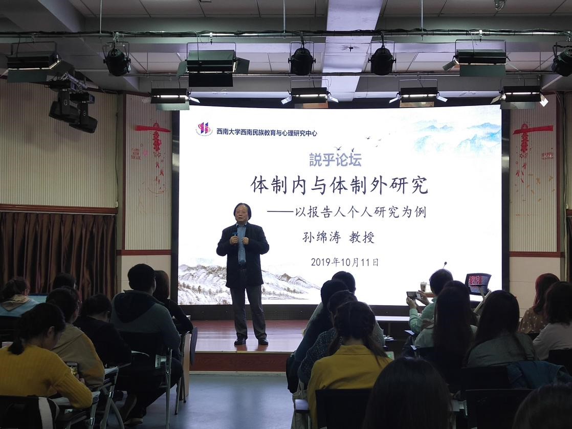 10月11日下午,西南民族教育与心理研究中心(以下简称“中心”)特邀沈阳师范大学教育经济与管理研究所所长、博士生导师孙绵涛教授做客説乎斋报告厅作《体制内与体制外研究——以报告人个人研究为例》主题讲座。会议由中心主任张学敏教授主持,中心部分老师和全体硕博研究生参加了此次讲座。
