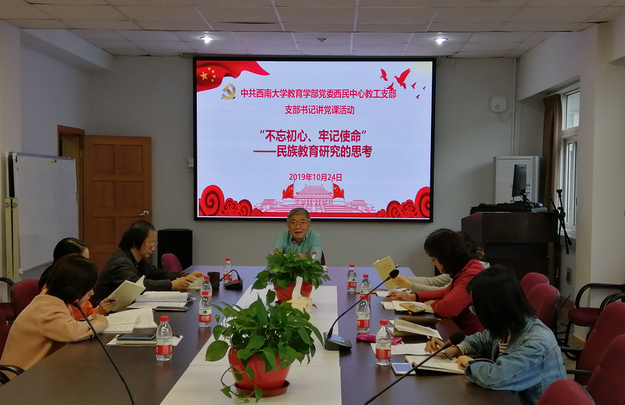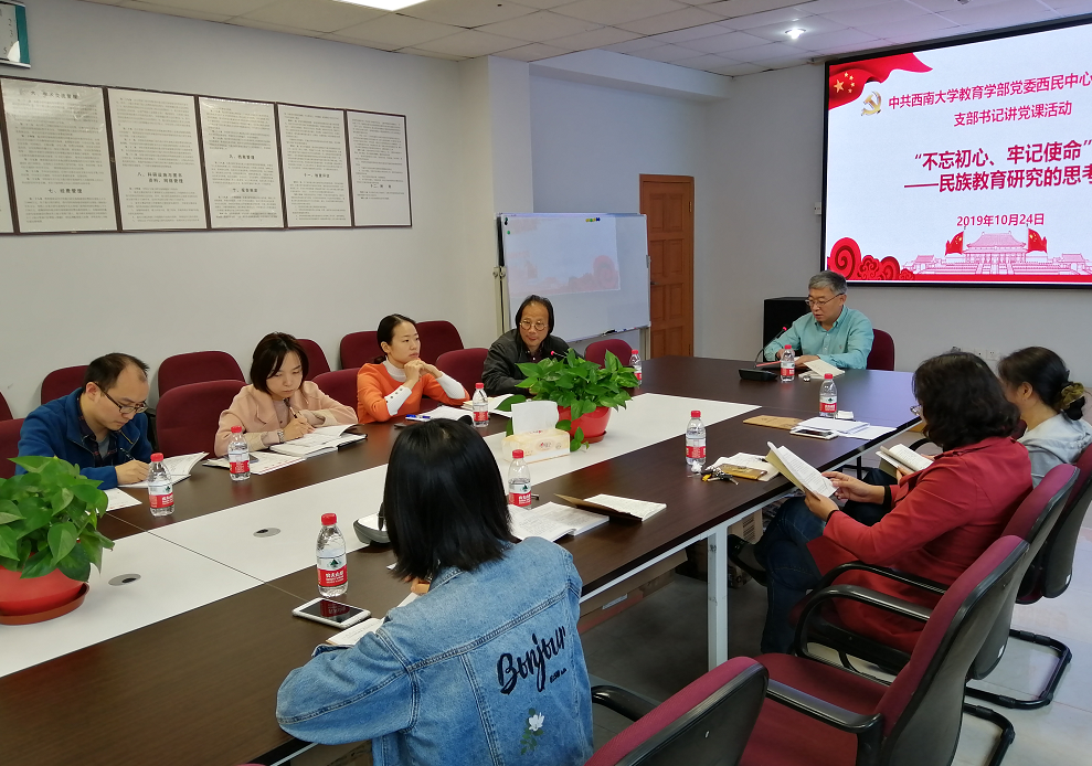 为深入学习《习近平关于“不忘初心、牢记使命”论述摘编》精神,进一步贯彻落实《关于开展“不忘初心、牢记使命”主题教育工作方案》,2019年10月24日上午,best365英国体育在线西南民族教育与心理研究中心教工支部(以下简称“西民中心教工支部”)全体同志在荟文楼537会议室举行支部书记讲党课活动。支部书记么加利同志以“‘不忘初心、牢记使命’——民族教育研究的思考”为题讲授党课,支部全体党员、西民中心博士生支部书记家晓余、硕士生支部书记陈伦超参加了党课学习并深入交流个人学习心得。