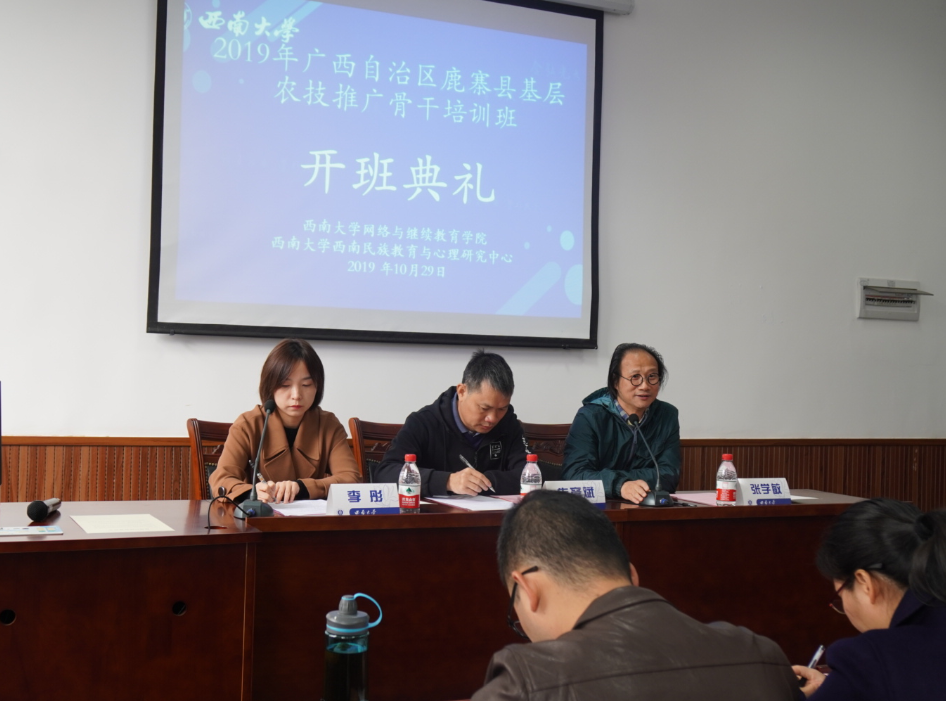 10月29日上午,由西南民族教育与心理研究中心(以下简称“中心”)承办的 2019年广西自治区鹿寨县基层农技推广骨干培训班开班典礼在best365英国体育在线兰苑宾馆8302会议室顺利举行。中心综合办主任李彤主持典礼,广西鹿寨县农业农村局副局长朱彦斌、中心主任张学敏教授出席典礼并作讲话。广西自治区鹿寨县基层农技推广骨干共计49人参加培训学习。