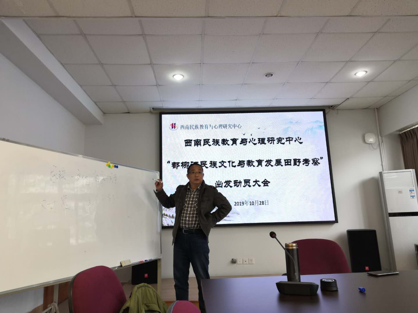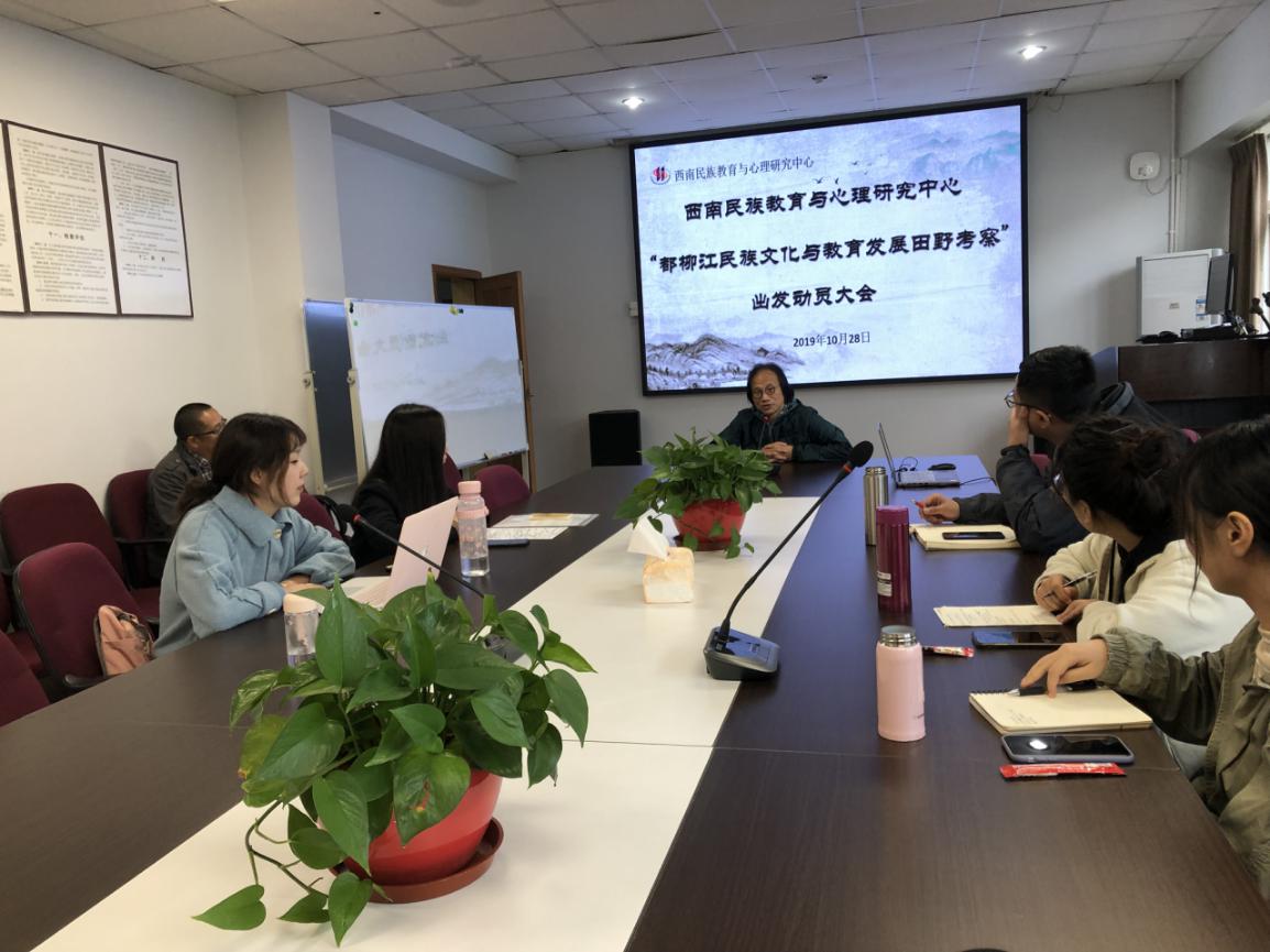 10月28日上午,调查组在荟文楼537会议室举行行前动员大会,会议由组长蒋立松研究员主持,中心主任张学敏教授作工作指导,调查组全体成员参加会议。本次田野调查工作主要围绕参与体验当地民俗生活、深入中小学校实地考察“民族文化进校园”现状、走访政府部门了解其开发打造和传承民族文化的重要举措三方面内容展开,旨在践行中心“学,在野”的人才培养模式,深化研究生在真实田野场域中学习和应用田野调查理论、方法和技巧,实现在做中学的目的。