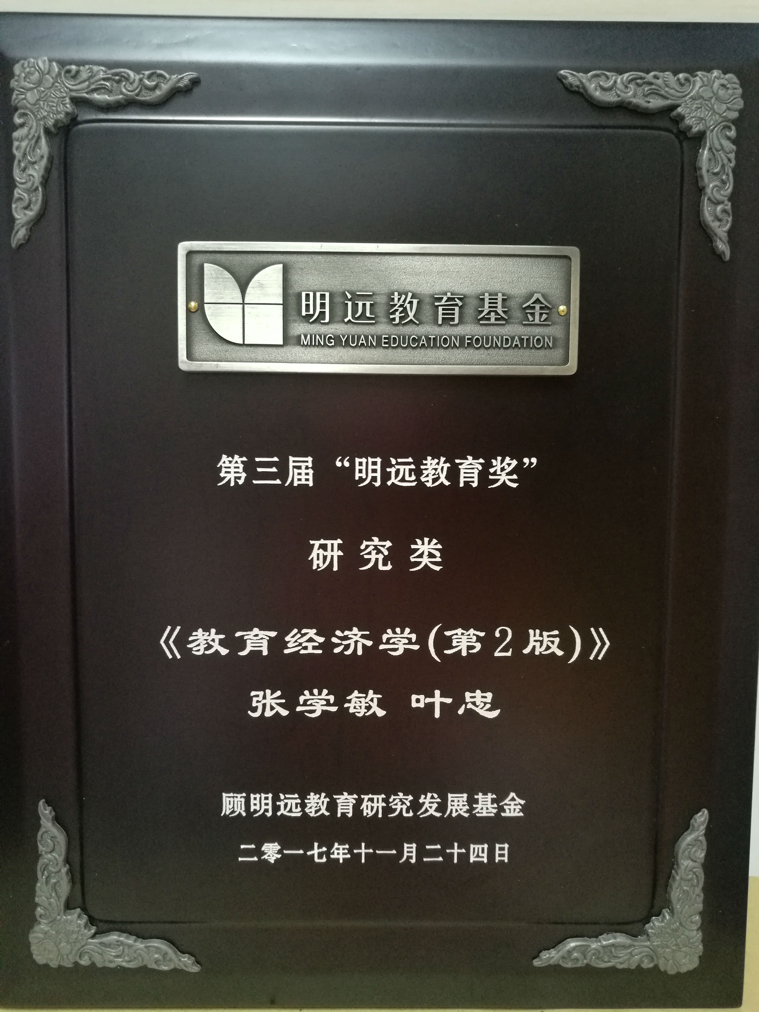 我中心主任张学敏教授与叶忠《教育经济学(第二版)》获第三届明远教育奖(研究类),研究类为引导教育实践变革做出突出学术贡献的中青年教育研究工作者,面向全国评选奖励5项成果。