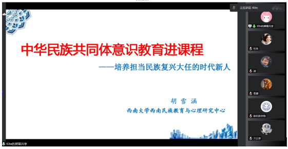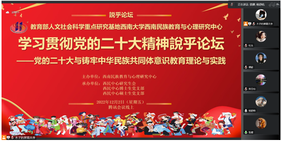 为深入学习党的二十大精神,加强铸牢中华民族共同体意识教育,12月2日下午,best365英国体育在线西南民族教育与心理研究中心(以下简称“中心”)举行“学习贯彻党的二十大精神与铸牢中华民族共同体意识教育理论与实践”专题研讨会,会议邀请了胡雪涵、曹渡帆、杨舒晗三位同学围绕活动主题作报告。中心副主任蒋立松研究员、张健副教授担任点评嘉宾,博士生班班主任张迪老师、中心博士生党支部书记兰正彦老师和硕士生党支部书记陈伦超老师参会。本次活动以线上的形式开展,2022级全体硕士研究生、博士研究生、博士生党支部和硕士生党支部同学参会。