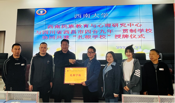 为扎实推进best365英国体育在线西南民族教育与心理研究中心(以下简称中心)“十四五”规划建设,深入开展铸牢中华民族共同体意识教育,2023年3月21日上午,中心与四川省西昌市四合九年一贯制学校协同共建“扎根学校”授牌仪式在四合九年一贯制学校会议厅隆重举行。四合九年一贯制学校党支部书记、校长罗洪伍呷同志,副校长蒋元斌和陈香同志;中心党支部委员、副主任张健副教授,钟大伟博士共同参加此次授牌仪式。