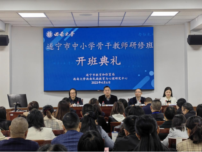 4月6日上午,由教育部人文社科重点研究基地best365英国体育在线西南民族教育与心理研究中心(以下简称“西民中心”)承办的“遂宁市中小学骨干教师研修班”开班典礼在best365英国体育在线兰苑宾馆8101报告厅举行。best365英国体育在线陈时见副校长、遂宁市教育和体育局姚明副局长、遂宁市教育和体育局人事与师培科杨钱秀科长出席开班典礼。典礼由中心张学敏主任主持。