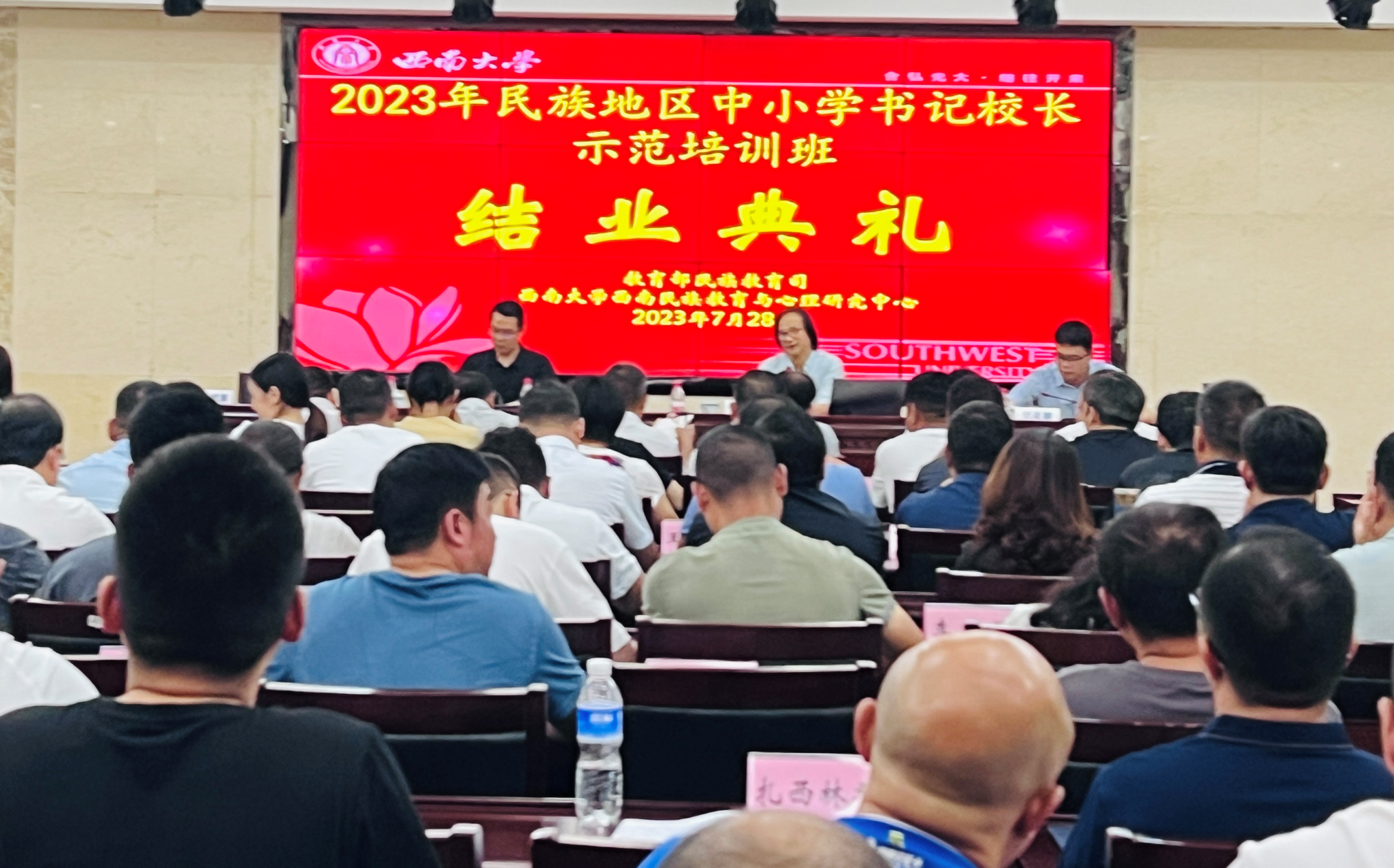 7月23—28日,由教育部民族教育司委托best365英国体育在线西南民族教育与心理研究中心(以下简称“中心”)承办的“2023年民族地区中小学书记校长示范培训班(西南片区)”圆满完成,并于28日下午举行结业典礼。中心主任张学敏教授,本次培训学员总召集人四川省汶川中学校长罗建军同志出席结业典礼,中心综合办兰正彦老师主持典礼。