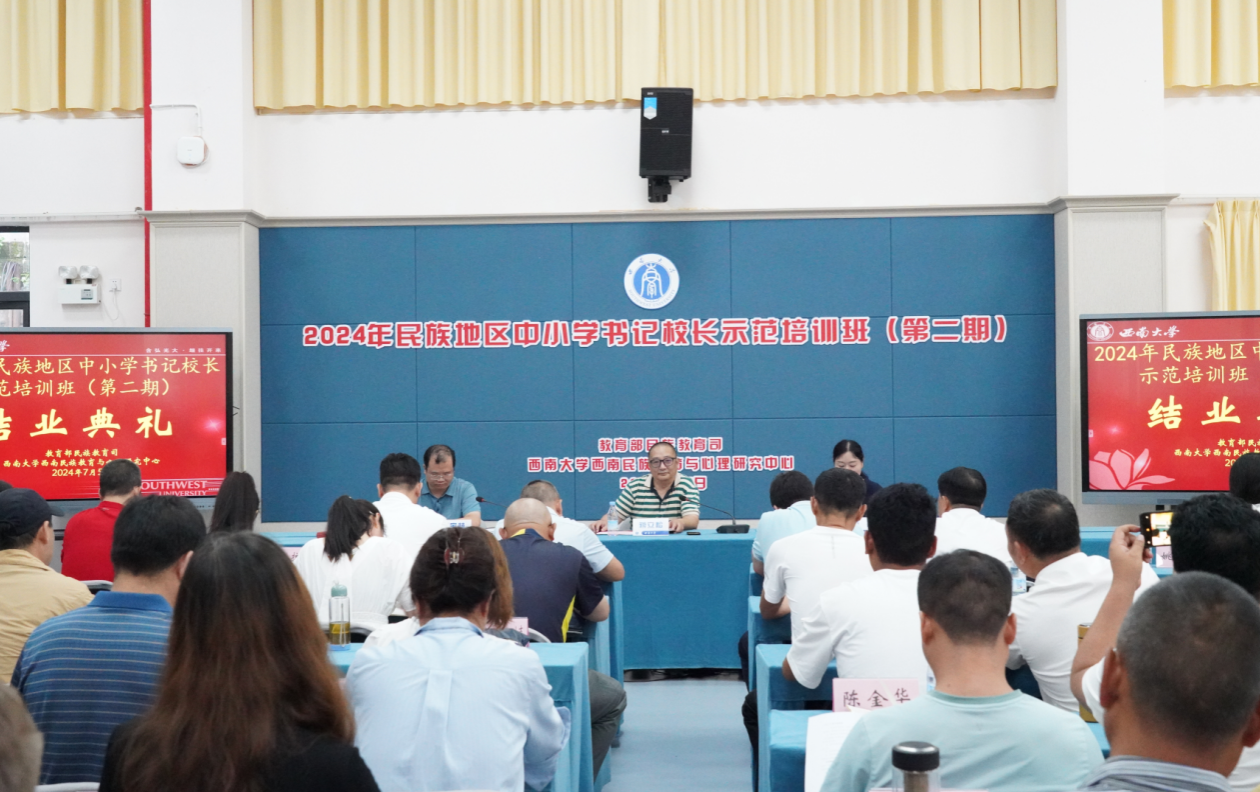 7月1日—7月5日,由教育部人文社会科学重点研究基地西南民族教育与心理研究中心(以下简称“中心”)承办的民族地区中小学书记校长示范培训班(第二期)圆满完成,并于5日上午顺利举行结业仪式。广西桂林市灌阳县高级中学书记、校长刘宝林、中心副主任蒋立松研究员出席此次结业仪式并讲话,仪式由中心主任助理陈荟同志主持。