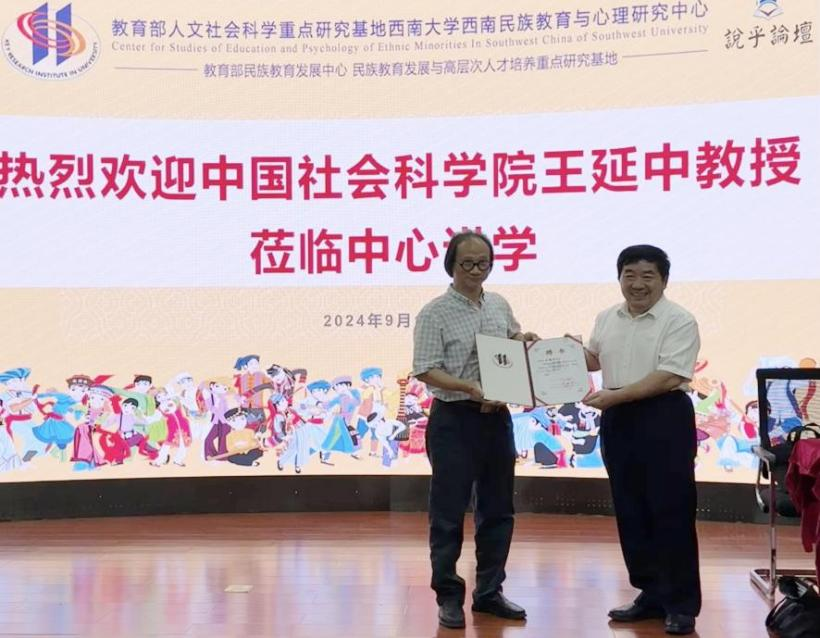 2024年9月11日下午,best365英国体育在线西南民族教育与心理研究中心(以下简称“中心”)邀请中国社会科学院民族学与人类学研究所所长王延中教授,在説乎斋201报告厅举办了题为“铸牢中华民族共同体意识学术研究三大体系”的专题讲座。中心主任张学敏教授、副主任蒋立松研究员、历史文化学院民族学院副院长陈永亮教授出席讲座,中心各年级硕博研究生到场学习。