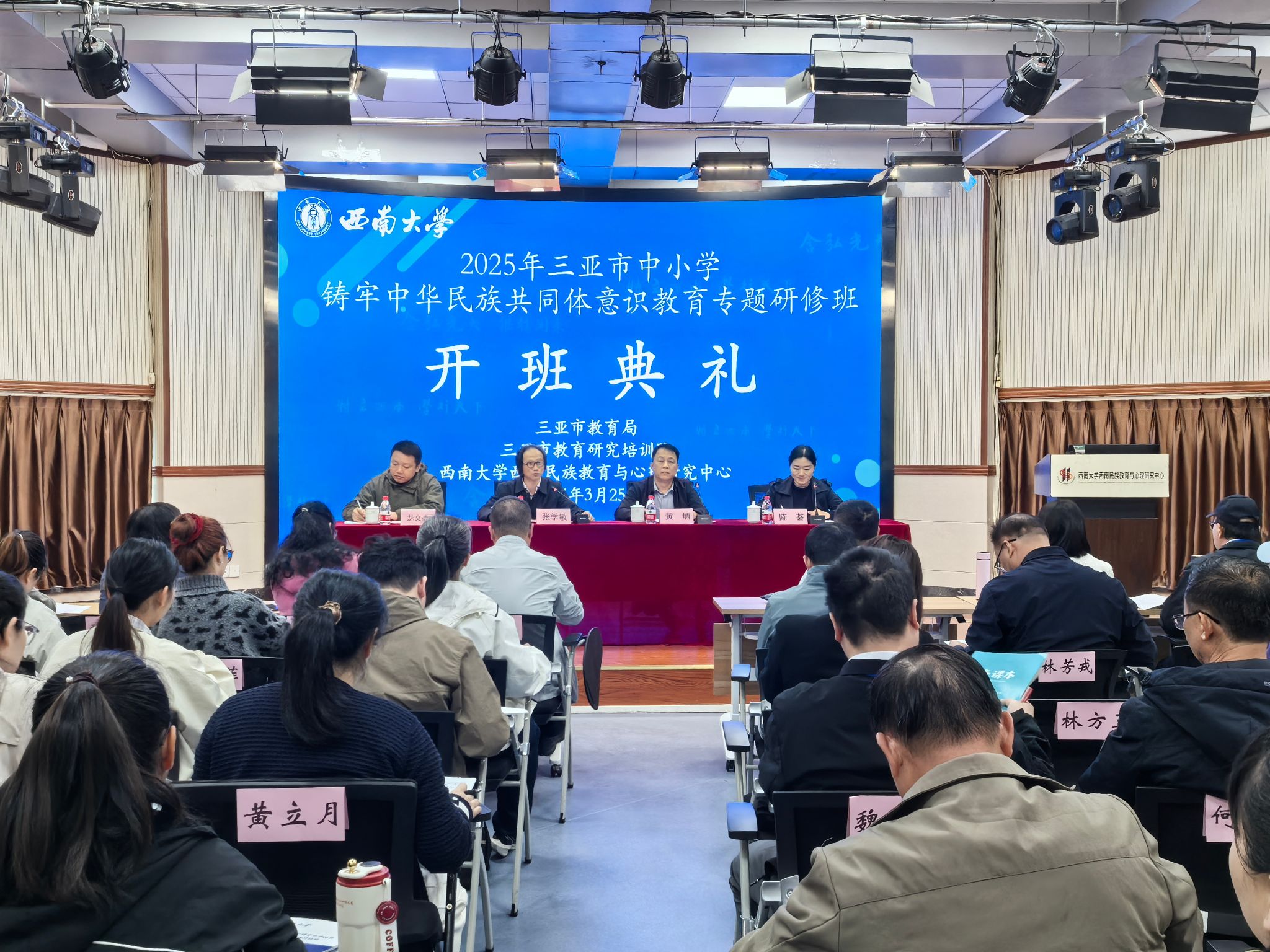 3月25日上午,由教育部人文社科重点研究基地best365英国体育在线西南民族教育与心理研究中心(以下简称“中心”)承办的“2025年三亚市中小学铸牢中华民族共同体意识教育专题研修班”开班仪式在中心説乎斋201报告厅举行。三亚市教育研究培训院(以下简称“教培院”)培训中心黄炳主任,教培院教研员龙文杰同志,中心主任张学敏教授、中心主任助理陈荟教授,以及87名三亚市中小学教师出席仪式,仪式由陈荟教授主持。