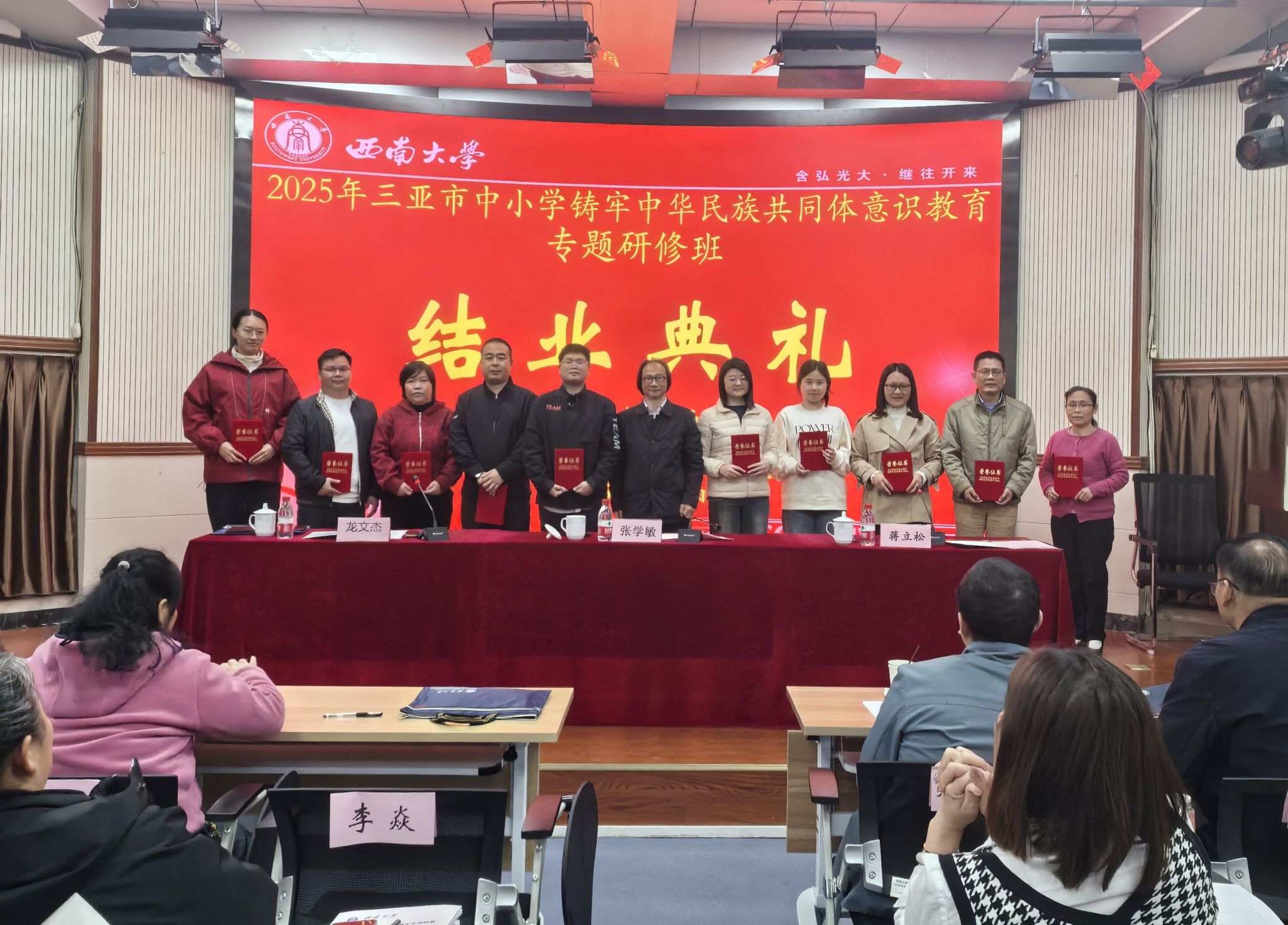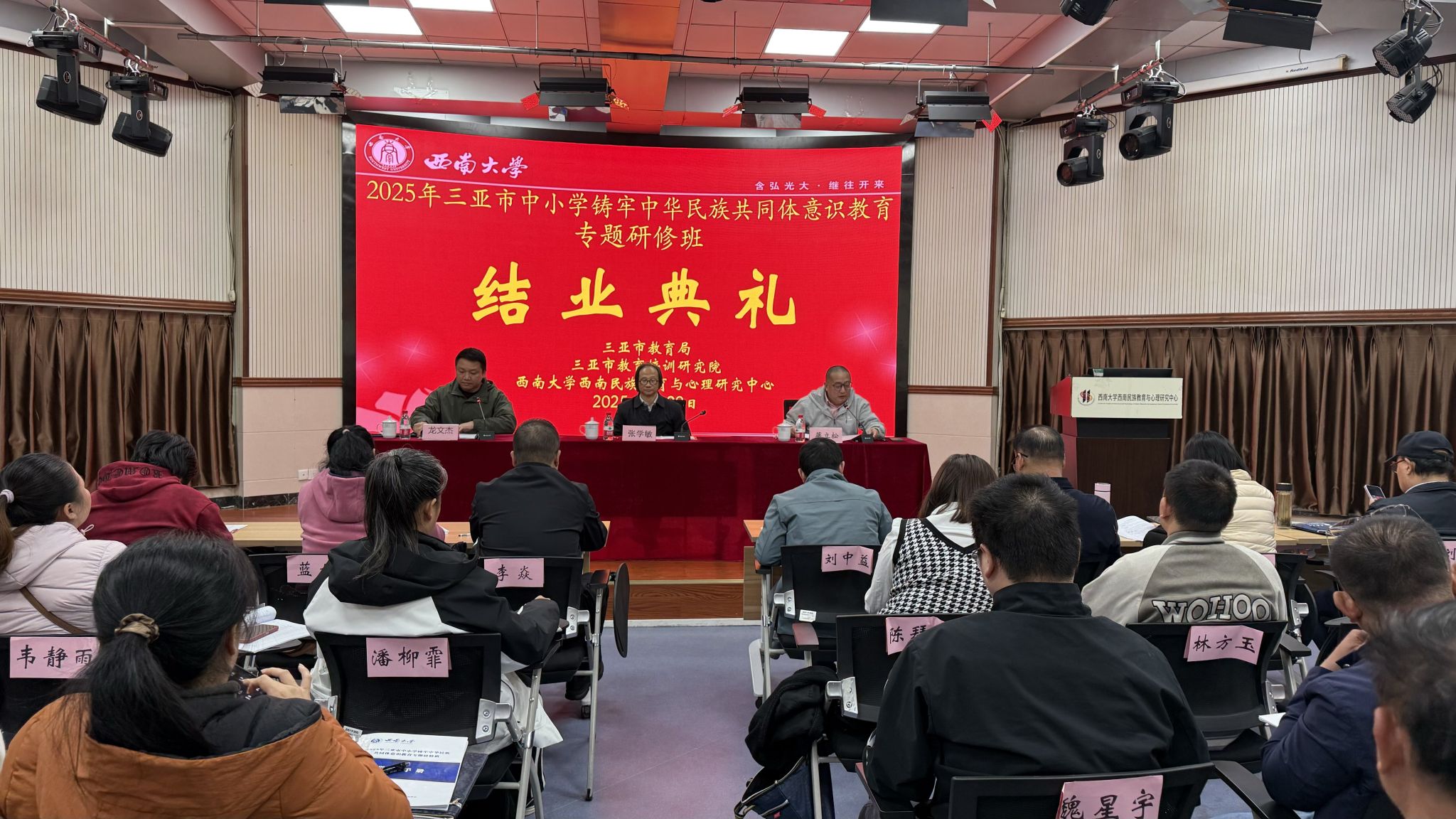 3月24日—3月29日,由教育部人文社会科学重点研究基地西南民族教育与心理研究中心(以下简称“中心”)承办的“2025年三亚市中小学铸牢中华民族共同体意识教育专题研修班”圆满完成,并于29日下午顺利举行结业仪式。三亚市教育培训研究院(以下简称“教培院”)教研员龙文杰同志、中心主任张学敏教授出席此次结业仪式并讲话,仪式由中心副主任蒋立松教授主持。