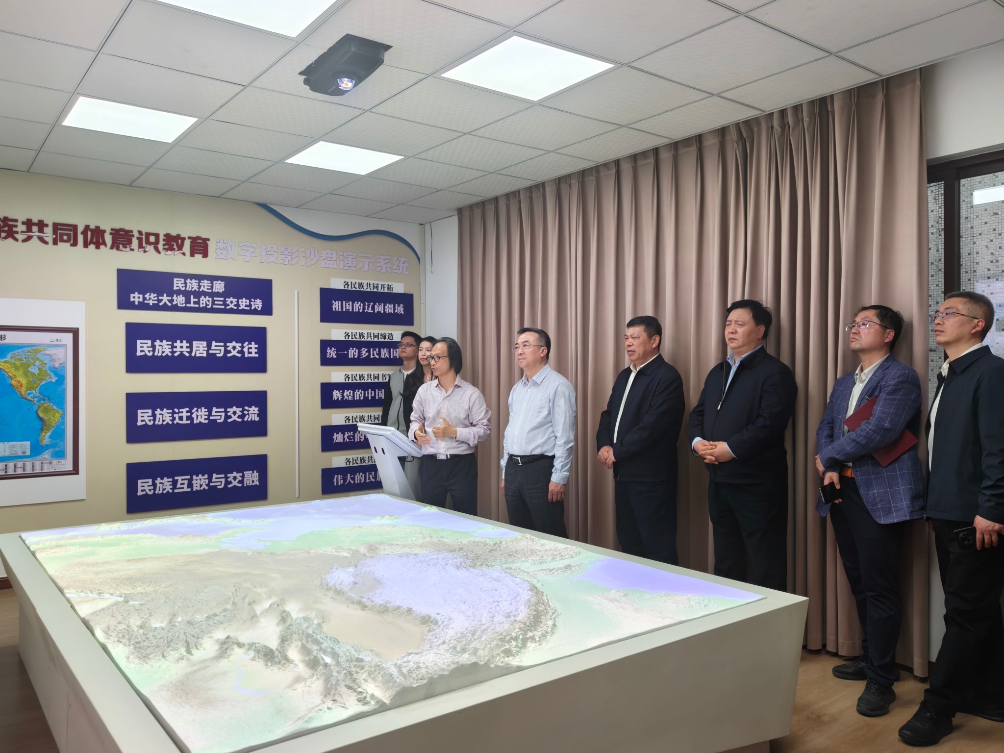 商奎一行考察了中心的“铸牢中华民族共同体意识教育实验室”,听取了中心主任张学敏教授关于中心建设背景、有关铸牢中华民族共同体意识教育研究工作成果的汇报。商奎对中心开展的工作及取得的成效给予充分肯定,他指出要将铸牢中华民族共同体意识相关研究成果回馈到学校中去,融入教育教学实践中,拓宽研究视野,注重数字化赋能,扎实推进实验室“铸”和“牢”的两个维度的研究。