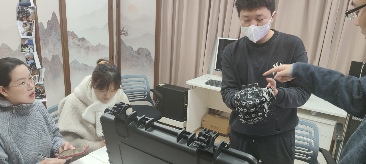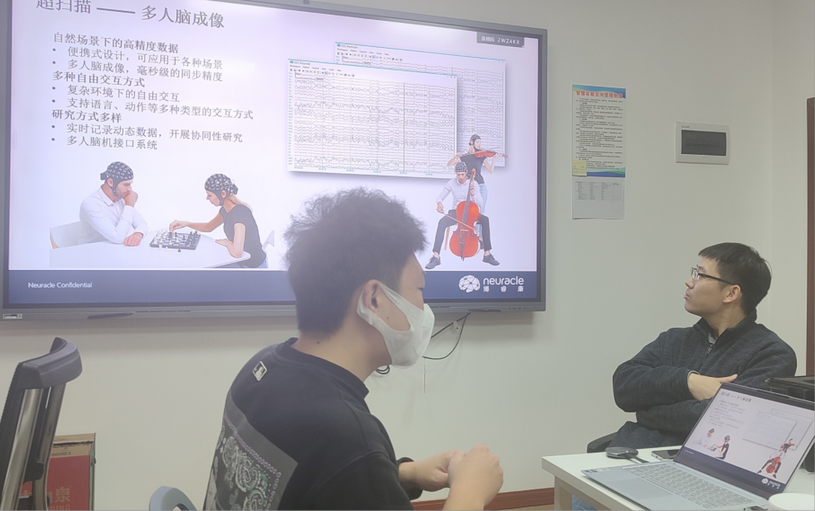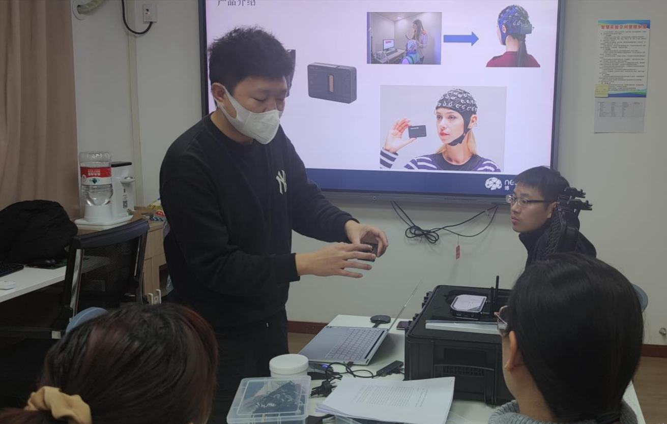 会上,袁工程师首先就便携式脑电采集设备进行了详细讲述,并向与会师生展示了脑电设备的连接及使用步骤。与会师生积极参与了后续实操过程并就相关问题与袁工程师进行交流互动。