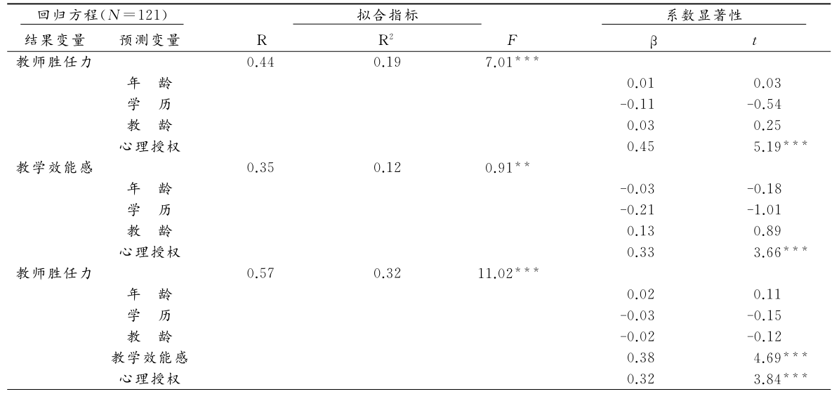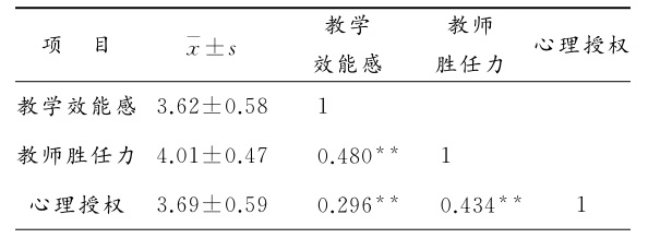 分析发现,中小学教师教学效能感、心理授权、教师胜任力两两正相关,其中教学效能感与教师胜任力的相关系数为0.48、教学效能感与心理授权的相关系数为0.296,教师胜任力与心理授权的相关系数为0.434,见表1。