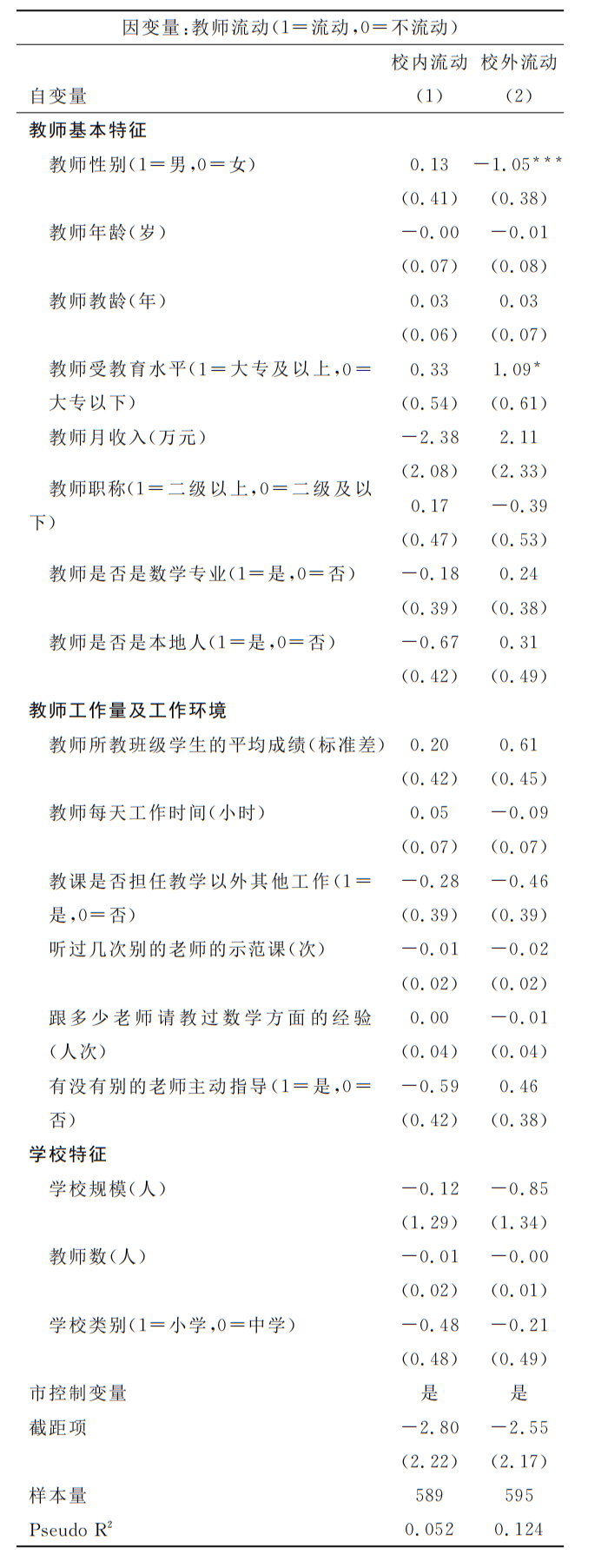 基于上述文献,本文通过logit模型分析影响教师流动的因素。具体为: