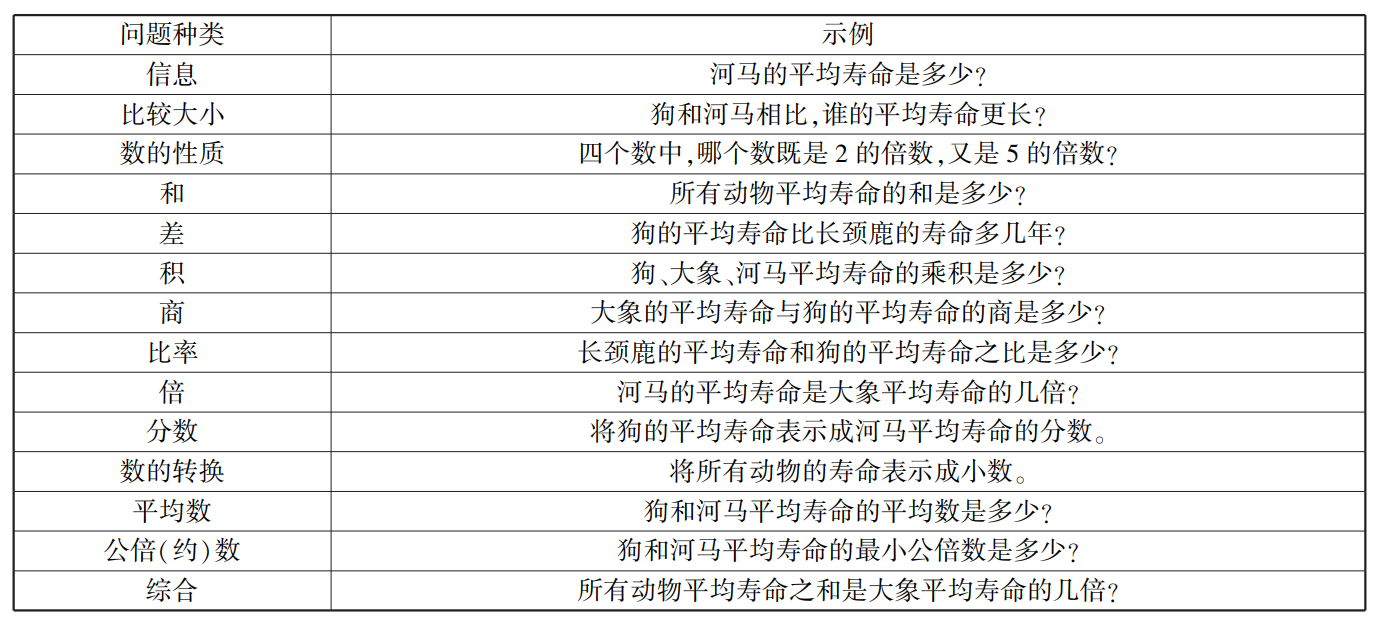 第三,对于满足有效性的数学问题,进一步考查问题提出的异质性,即考查学生所提出的数学问题在结构上是否相同。例如,“河马的平均寿命是狗的平均寿命的几倍”与“狗的平均寿命是河马的平均寿命的几倍”记作结构相同的问题。结构相同的问题仅计数1次。因此,问题提出的异质数量反映学生提出的问题中,包含几种不同的问题结构。