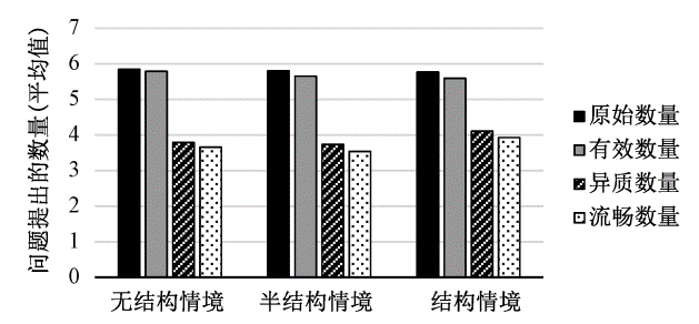 每种情境下的问题提出数量如图3所示。可以发现,三种情境下,问题提出的原始数量和有效数量的平均值都接近于最大值6。而问题提出的异质数量和流畅数量明显下降。三种情境中,结构情境下问题提出的异质数量和流畅数量最高。半结构情境下的问题提出异质数量与流畅数量最低。