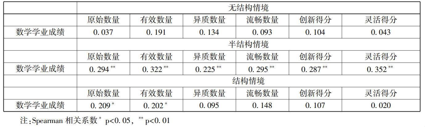 本研究考察了三种不同情境下的问题提出能力。在半结构和结构情境下,思维模式高分组与低分组学生在问题提出能力上存在显著差异。同时,思维模式低分组学生的数学学业成绩与问题提出能力的相关关系只出现在半结构和结构情境下。这表明,思维模式、数学学业成绩和问题提出能力的关系只存在于半结构和结构情境下。这体现了问题提出情境对问题提出能力所产生的影响。