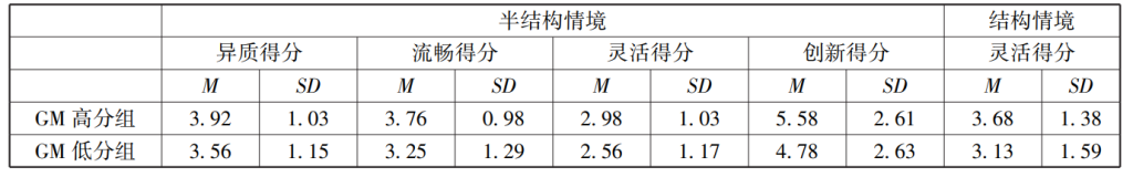 GM高分组在半结构情境下问题提出的异质得分(t= -2.421,p<0.05)、流畅得分(t= -3.214,p<0.01)、灵活得分(t= -2.753,p<0.01)和结构情境下创新得分(t= -2.270,p<0.03)、灵活得分(t= -2.691,p<0.01)显著高于GM低分组(见表4)。但是,GM高分组与GM低分组在无结构情境下问题提出能力上没有显著性差异。