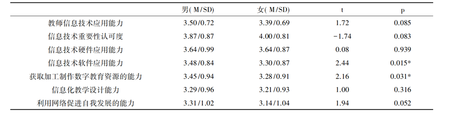 独立样本t检验表明,男教师在信息技术软件应用能力、获取加工制作数字教育资源的能力两个维度上的得分显著高于女教师,在其他维度上男女教师之间不存在显著差异。(见表2)