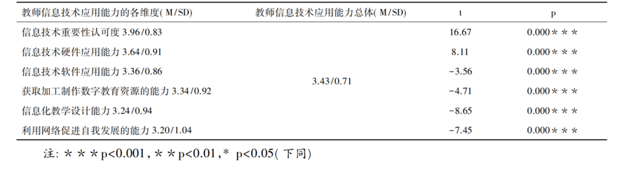 本研究使用问卷的题项均采用李克特5点计分方式,以“1—5”代表符合程度,得分越高表明教师的信息技术应用能力越高。数据分析采用统计软件(SPSS19.0)进行,包括描述性统计、相关分析、配对样本t检验、独立样本t检验、单因素方差分析等。