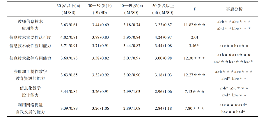 单因素方差分析表明,不同年龄阶段的教师在信息技术重要性认可度上不存在显著差异,但在信息技术应用能力及其下属其他维度上均存在显著差异。经事后多重比较,30岁以下教师在信息技术应用能力和信息技术软件应用能力、获取加工制作数字教育资源、信息化教学设计能力上的得分显著高于其他年龄段教师;30—39岁教师在信息技术应用能力和信息技术硬件应用能力、信息技术软件应用能力、获取加工制作数字教育资源的能力、信息化教学设计能力、利用网络促进自我发展的能力上的得分显著高于40—49岁的教师。(见表3)
