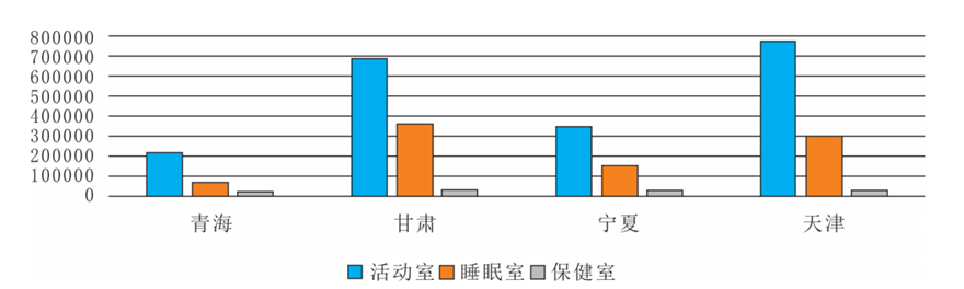 《国务院关于当前发展学前教育的若干意见》颁布并实施后,中央加大了对西部民族地区学前教育政策、资金等方面的支持,随后一系列相关文件和三期学前教育行动计划出台,虽然这些政策涉及到了包括办园、卫生等在内多方面的质量标准和评估方法,但我国至今还未形成针对西部民族地区学前教育的系统的质量标准体系,致使西部民族地区幼儿园基础设施建设规划混乱,达标程度难以检验。以民族地区青海、甘肃、宁夏三省为例,2019年三省活动室面积分别为221601.72m2、690402.35m2、352098.72m2,睡眠室面积分别为71807.87m2、360846.21m2、154707.09m2,保健室面积分别为6199.81m2、37455.27m2、11336.62m2。④如图1所示,青海和宁夏与东部地区(天津)之间三类基础设施建筑面积差距较大,同为民族地区的甘肃学前教育基础设施建设远远优于青海和宁夏,应注意到民族地区兄弟省份间基础设施建设存在不平衡状况,反映出民族地区学前教育基础设施建设要求落实程度不一的问题。由此看来民族地区较多幼儿园的基础设施远低于国家最低要求,无法满足基本的教学要求,难以支撑幼儿身心健康发展。