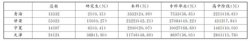 民族地区学前教育的师资主要来源于特岗计划、定向培养与免费师范生等方式,教师的学历、职称、素质等各方面普遍较低。[22]根据表1可以看出青海、甘肃、宁夏三个民族地区研究生和本科学历的专任教师占比明显少于东部地区(天津),专科学历和高中学历的专任教师占比较多。筛选假设理论认为文凭反映了一个人固有的能力,民族地区专任教师学历层次较低反映出教师专业水平较低的问题。对黔东南台江县62所幼儿园的调查中发现,该县幼儿教师多为无幼儿教师资格证的转岗教师,62所幼儿园共有教职工481人,持有教师资格证的仅有281人。[23]民族地区无论是公办还是民办、乡村还是城市幼儿园,幼儿教师缺口大,专业水平低的现象较为普遍,制约了学前教育质量的进一步提升。