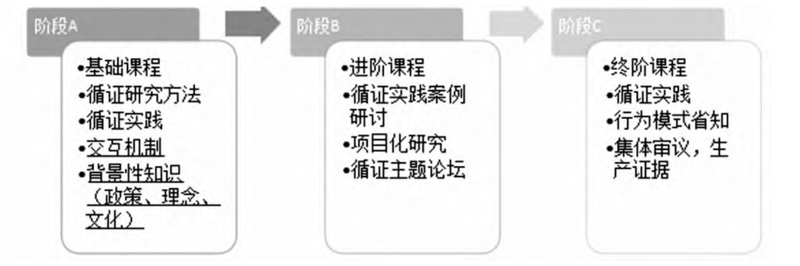 循证式培训在培训设计、实施、评价上将围绕民族地区乡村教师循证实践意识的培育、自主循证实践能力的养成开展,在具体实操层面将教、学、实践统一整合于教育实践问题的解决上,课程的内容、资源、活动、结果都是为问题的解决提供证据,为个体乡村教师经验精进提供有效的智力帮扶。培训课程依据个体循证实践能力提升的规律分为A、B、C等三阶(见图1)。