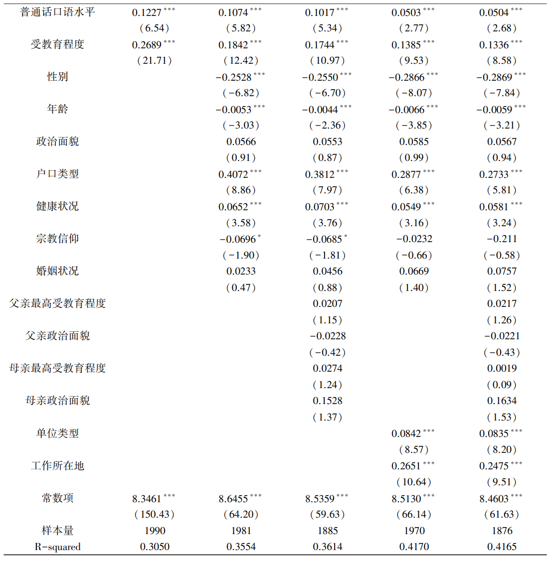 具体而言,第(1)列回归仅对核心解释变量(普通话能力与受教育程度)进行分析,结果显示普通话听力水平与口语水平的收入效应分别为0.1529与0.1227,受教育水平的收入效应为0.2708与0.2689。但由于回归中并未加入控制变量,普通话能力和受教育程度对收入影响系数的计算结果偏大,回归解释力度不足。