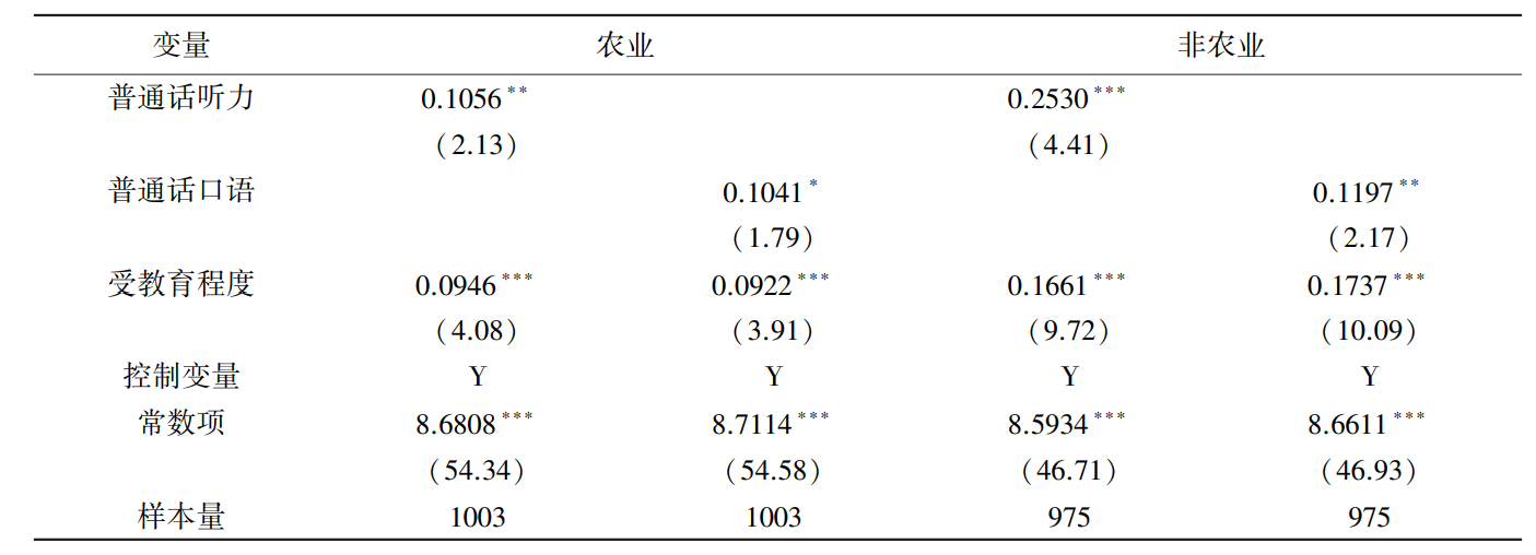 回归结果显示,在农业组别,普通话能力对少数民族劳动力收入的影响系数分别为0.1056和0.1041,均大于受教育水平的影响系数(0.0946和0.0922)。这表明相比于受教育程度,普通话熟练程度对务农劳动者收入的拉动作用更为明显。普通话的学习加强了农村与外界社会的联系,使务农人员接触到更多的学习机会,提高种植技术,实现经济效益的增加。在非农业组别,普通话能力的影响系数分别为0.2530和0.1197,大于农业组别的影响系数(0.1056和0.1041)。因而相较于农业组别,普通话能力作为人力资本的重要形式,对非农劳动力收入的拉动作用更加明显。