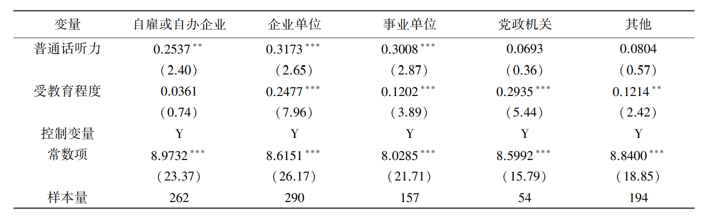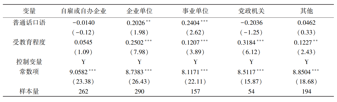 为进一步对比不同行业中普通话熟练程度对少数民族劳动力收入影响的差异,本研究将样本中的非农业组别按行业分为自雇或自办企业、企业单位、事业单位、党政机关和其他五个组别(由于军队和社会团体的样本量较少,故将其舍去)进行分组回归,回归结果如表8和表9所示。