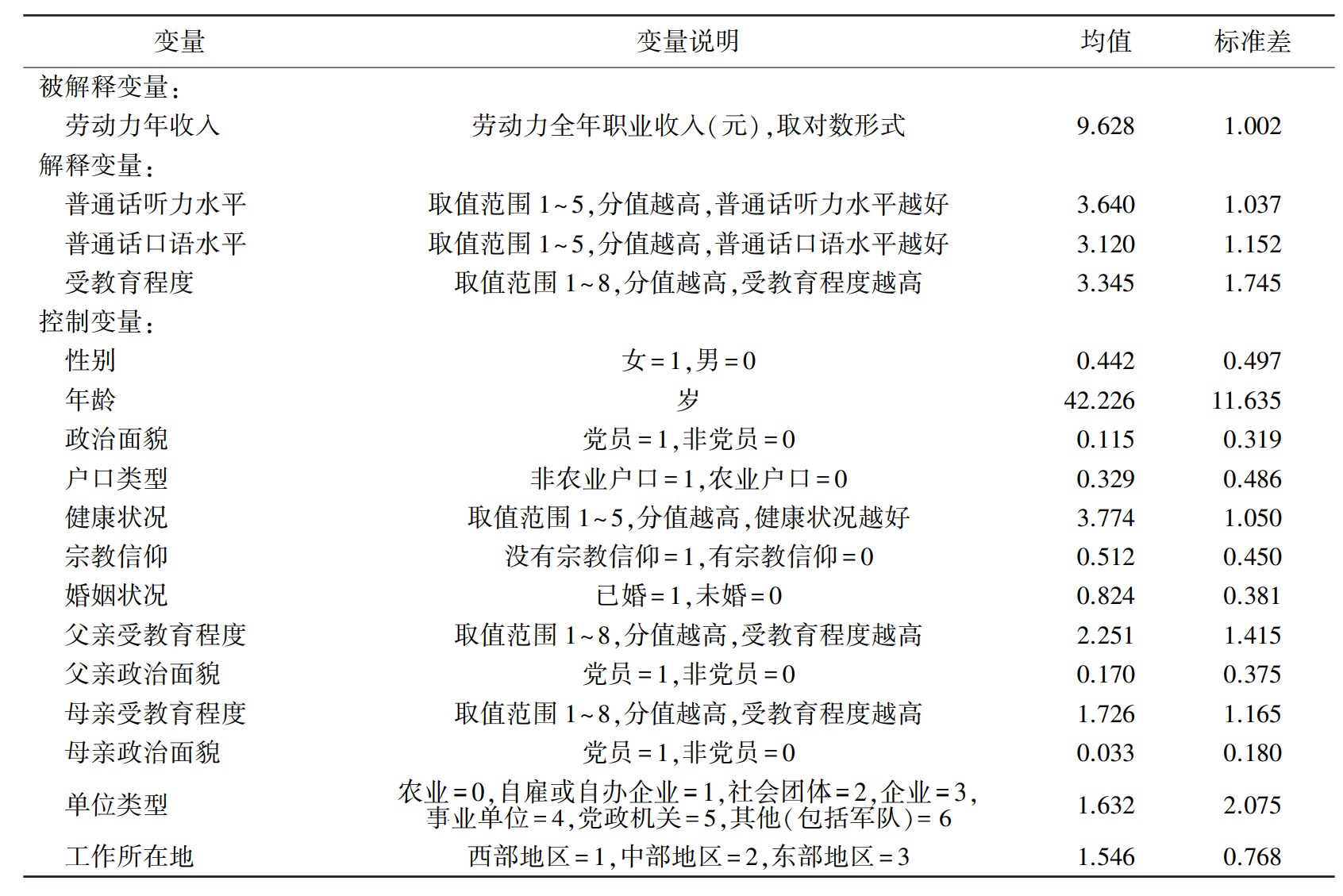 核心解释变量为普通话能力及受教育程度。其中,普通话能力又分为“普通话口语水平”和“普通话听力水平”(由于数据的可获得性与权威性,本文取口语和听力水平代表国家通用语言文字应用能力)。CGSS问卷中将普通话能力分为“很好”“比较好”“一般”“比较差”“完全听不懂/完全不会说”五个等级,被访者在1~5的范围内对普通话听说能力进行评分,分值越高代表其熟练程度越好。受教育程度从“没有接受过任何教育”到“研究生及以上学历”共划分为8个层次,在1~8的范围内对其进行赋值,分值越高代表劳动者的受教育程度越高。