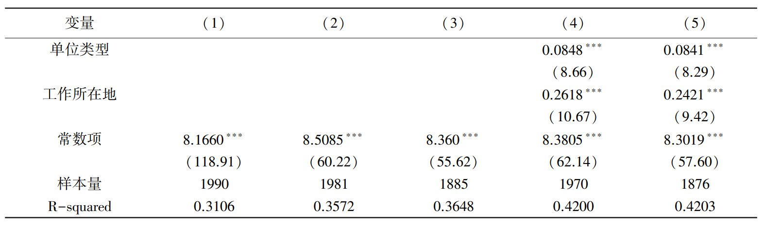 第(5)列回归将所有控制变量考虑其中,得出普通话听力水平与口语水平的收入效应分别为0.0863与0.0504,受教育水平的收入效应为0.1312与0.1336。各变量影响系数和可决系数与第(4)列相比均未存在较大差异,回归结果与第(4)列基本相同。