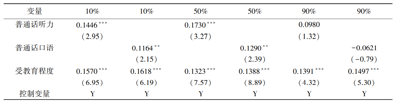 表2和表3的OLS回归为样本总体回归结果,表示普通话能力对少数民族劳动力收入的影响,但若要探究不同收入层次下普通话能力对收入的具体影响,还需进行分位数回归,以评估不同收入层次劳动力的普通话回报率。一般在进行分位数回归时,多采用0.1、0.25、0.5、0.75和0.9分位点对被解释变量进行分位。考虑到本研究样本量,将样本按0.1、0.5和0.9三个分位点进行划分,同时剔除不显著的控制变量,分位数回归结果如表6所示。