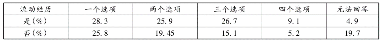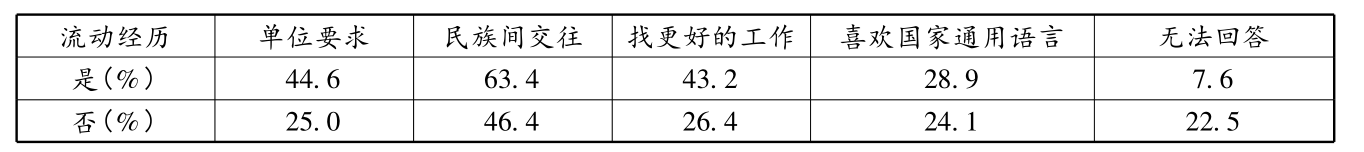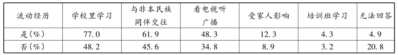 问卷中列出的学习途径主要有五项,包括:学校里学习、与非本民族同伴交往、看电视听广播、受家人影响、培训班学习。在调查结果中,在没有流动经历的人中,“无法回答”的被调查者明显多;有流动经历的人选择两项、三项、四项的较多,表明他们学习国家通用语言的途径更加多样。人口流动的趋势一般是从乡村流入城镇,从单语环境流入多语环境。城镇生活与乡村生活相比,社会化程度更高,这意味着有更多的机会接触其他民族人群;城镇生活与乡村生活相比,现代化程度也更高,接触各种文化与娱乐传媒的意识更强,与乡村生活有明显的区别,社会交际网络也明显拓宽了。因生活范围的扩大,接触其他民族的语言文化的机会增多,接受的信息量也扩大了,人的知识储备和整体素质自然会得到提升。这种良性的拉动,必然强化少数民族对这一交际工具即国家通用语言的认同。