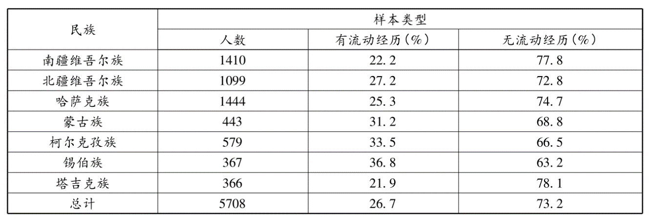 本研究的问卷调查范围涵盖了新疆维吾尔自治区的13个地州市。入户调查及专项调查的抽样分布具体为:喀什地区的维吾尔族、塔吉克族,和田地区、吐鲁番市的维吾尔族,克州的柯尔克孜族和维吾尔族,伊犁州(含伊犁州直、塔城、阿勒泰)的哈萨克族、维吾尔族和锡伯族,博州及巴州的蒙古族、维吾尔族,哈密市、乌鲁木齐市的维吾尔族、哈萨克族等。最终获取有效样本量5718份。调查对象中有流动经历(主要指曾跨地州市居住两年及两年以上)的样本量1524个;一直生活在本地区,从未(或仅偶尔)外出的样本量4184个。其中10个样本对“是否有过流动”无法做出回答,从有效样本量中扣除,得到统计样本总量为5708个。抽样显示,有流动经历的人不足三成,基本符合新疆人口流动一般规律。全疆各民族样本抽取结果见表1。