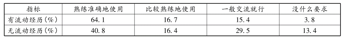 “熟练准确地使用”和“比较熟练地使用”两项属于期望值较高的选项,“一般交流就行”和“没什么要求”属于期望值较低的选项。显然,追求“熟练准确地使用”的,有流动经历人群64.1%的比例明显高过无流动经历40.8%的比例。与此形成鲜明对照的是,选择“一般交流就行”和“没什么要求”的,无流动经历的比例明显更高。这说明,少数民族在外工作、学习、经商,对自己的国家通用语言水平要求也较高,认为只有这样才能满足不断增长的现实交际需要。进一步了解可知,选择“没什么要求”和“一般交流就行”的人群主要是老人、家庭妇女、农牧民,他们的生活所接触的事物有限,长期处于单一的母语环境,主要靠母语交际,对国家通用语言交际需求不大。这些人群多居住在乡村,流动性不强。即便是最终选择了向城镇的流动,也属于养老、陪伴等非创业型流动,语言学习的动力相对不足。