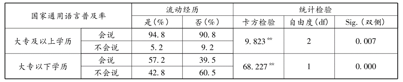 表2表明,有流动经历的在“能流利准确地使用”“能熟练使用但有些音不准”“能熟练使用但口音较重”三个等级的占比明显高于没有流动经历的;而在“能听懂一些但不会说”和“听不懂也不会说”两个等级的占比明显低于没有流动经历的。将前四等级(会说)和前三级(熟练)的数据进行整合,有流动经历的国家通用语言普及率为79.2%,其中达到国家通用语言熟练水平的占66.0%;没有流动经历的国家通用语言普及率为48.4%,其中国家通用语言熟练水平的占33.6%。通过卡方独立性检验结果(表3)显示,不同流动经历中国家通用语言水平具有明显的差异性,整体表现为,有流动经历的国家通用语言普及率和国家通用语言水平高于没有流动经历的。