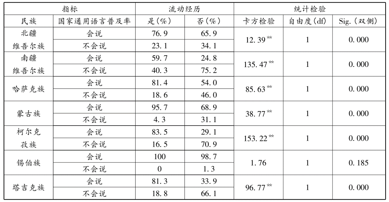 卡方独立性检验结果显示,锡伯族流动经历与国家通用语言普及率的卡方值1.76,显著值0.185(大于0.05),是否流动没有差异。其他5个民族中,流动经历与国家通用语言普及率卡方检验的显著值均小于0.05,人口流动因素对国家通用语言普及率均具有影响,但其中的差异性不同。结合入户调查等材料,进行了深入思考。