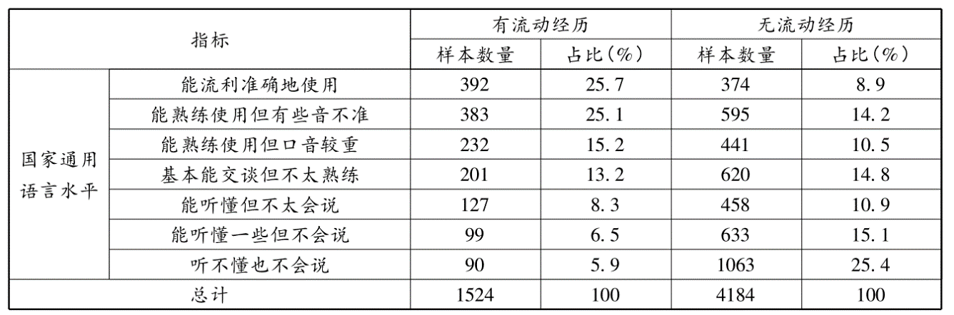 1.有流动经历的少数民族人群国家通用语言普及率为79.2%,国家通用语言水平熟练的占66.0%;没有流动经历的国家通用语言普及率为48.4%,国家通用语言水平熟练的为33.6%。有流动经历的国家通用语言普及率和国家通用语言水平明显高于没有流动经历的。