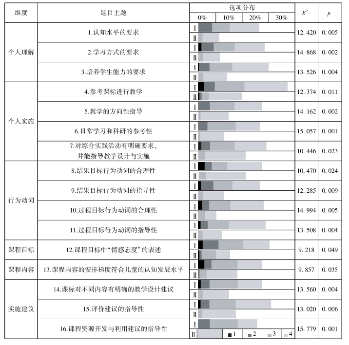 综合显著性与效应值,从表3中可以看到,差异最为突出的依次是个人理解、行为动词、个人实施和实施建议四个维度,理念与素养与课程目标两个维度存在一定的差异,地区实施与课程内容两个维度的差异不明显。进一步对各个维度下的问题进行卡方检验,将差异最为突出的试题重新编号并进行进一步的分析。选取的各维度下突出问题如表4所示。