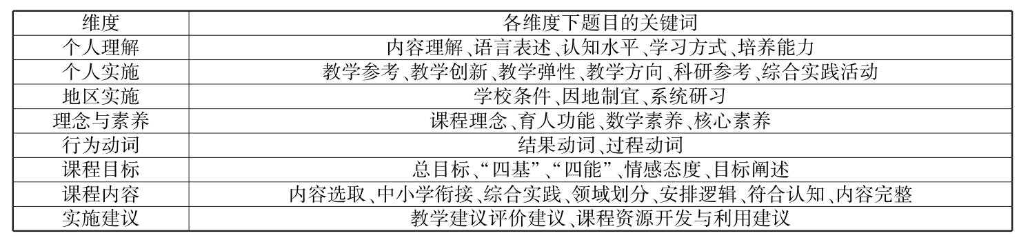 调查问卷依据数学课标文本的具体表述,结合教师日常教学的实际情况设计,初稿设计完成后,进行小规模测试,组织数学教育家、数学家、中小学校长、教研员、一线教师、考试命题人员、教材编写人员团队对问卷框架和条目内容进行多次研讨,就测试反馈情况对问卷修订,再进行二轮试测,重复第一轮的修订过程,形成最终的问卷,以保障问卷的内容和结构效度。问卷维度和各维度下的关键词如表1所示。问卷采用李克特五级量表形式,从1-5分别对应的是“完全不同意”“比较不同意”“一般”“比较同意”和“完全同意”,分数越高表示对条目表述的同意度越高。同时,基于问卷设计出访谈提纲,访谈更加侧重于调查课程标准实施的具体情况。问卷调查与访谈相辅相成,互为补充,形成最终的访谈提纲。