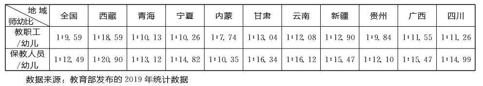教师和课程是质量提升的两翼。课程是将幼儿教育理念转化为幼儿园教育实践的桥梁。[6]幼儿园课程与中小学课程有着本质的区别。幼儿园课程打破分科壁垒,力图营造一个与幼儿生活本身高度一致的综合课程形态,以直接经验为基础的活动课程适合幼儿的年龄特点和学习规律,通过选择、改编、创造等方法综合开发的园本课程,更能够满足当地幼儿全面而富有个性的发展需要。西部民族地区幼儿园课程存在三方面亟待解决的问题。首先是幼儿园课程目标与内容的适宜性低。很多民族地区选择以都市文化为基础开发的课程资源,同时还缺乏基于当地文化和幼儿经验进行选择和转化的过程,幼儿园课程目标、课程内容与当地文化、幼儿发展的适配性低。另外,村级幼儿园和教学点的幼儿数量少,达不到按年龄分班的数量要求而采取混龄班教学,而当前幼儿园课程资源多是按照年龄班编制的,既缺乏适宜的课程资源,也没有可资借鉴的成熟经验,从而直接导致了学前教育质量低下。其次是缺失高质量课程实施的保障条件。游戏、生活和个性化教学是幼儿园课程实施的主要途径,师幼互动则是课程实施的核心。[7]统计2019年民族地区各省区的两类师幼比(表2),除了内蒙古自治区,其余九省区的师幼比均高于全国平均水平,且远高于国家规定的合理水平。③师幼比过高极易导致以集体上课为主、以讲授方式为主的教学过程,严重影响师幼互动的质量,从而滋生“小学化”倾向。第三则是幼儿园课程管理与评价重心偏移。重视课程的条件性管理,将管理与评价的重点放在检查教育文件、环境创设、教师职称与专业、项目论文等硬件条件,表现出重视教师评价,忽视儿童评价;重视条件性评价,忽视过程性评价;重视结果性评价,忽视发展性评价的评价重心偏移现象。